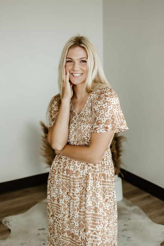 Floral Mocha Textured Midi Length Dress