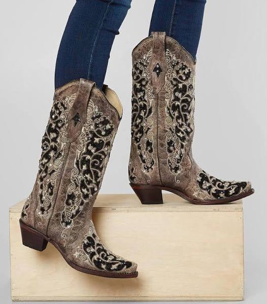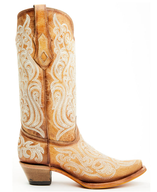 Corral Women's Straw Brown with Luminescent Embroidery Snip Toe Cowboy Boots
