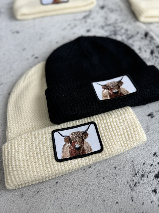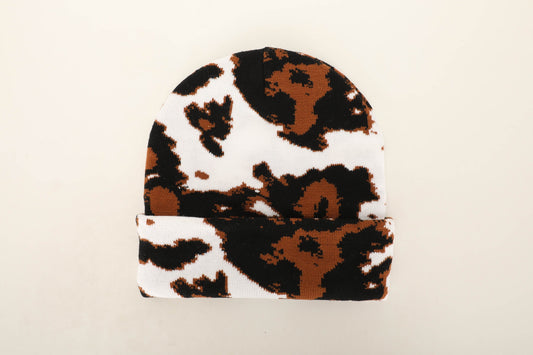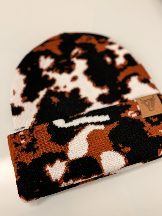 Splatter Paint Cow Print Beanie with Highland Cow Leather Patch