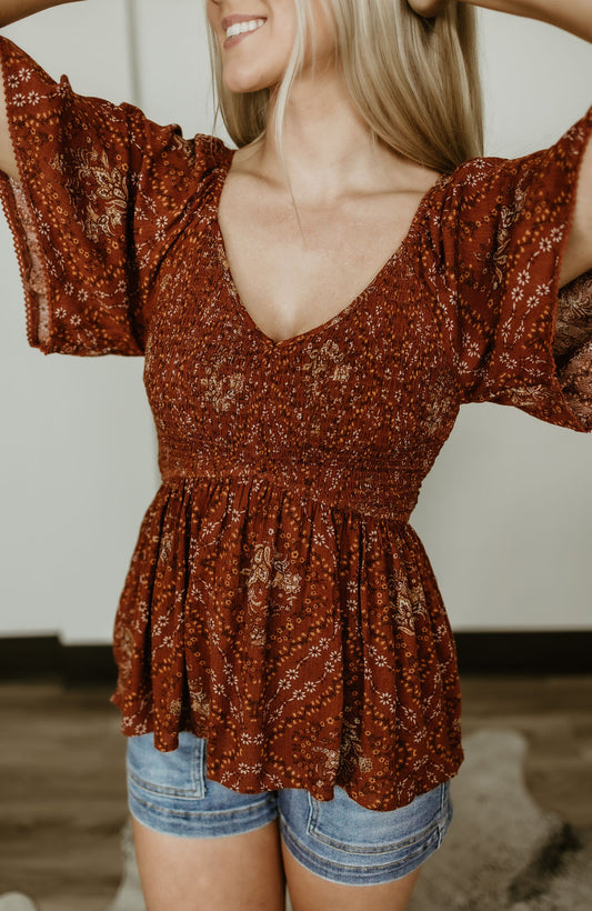 Womans Floral Flutter Sleeve Smocked Peplum Top