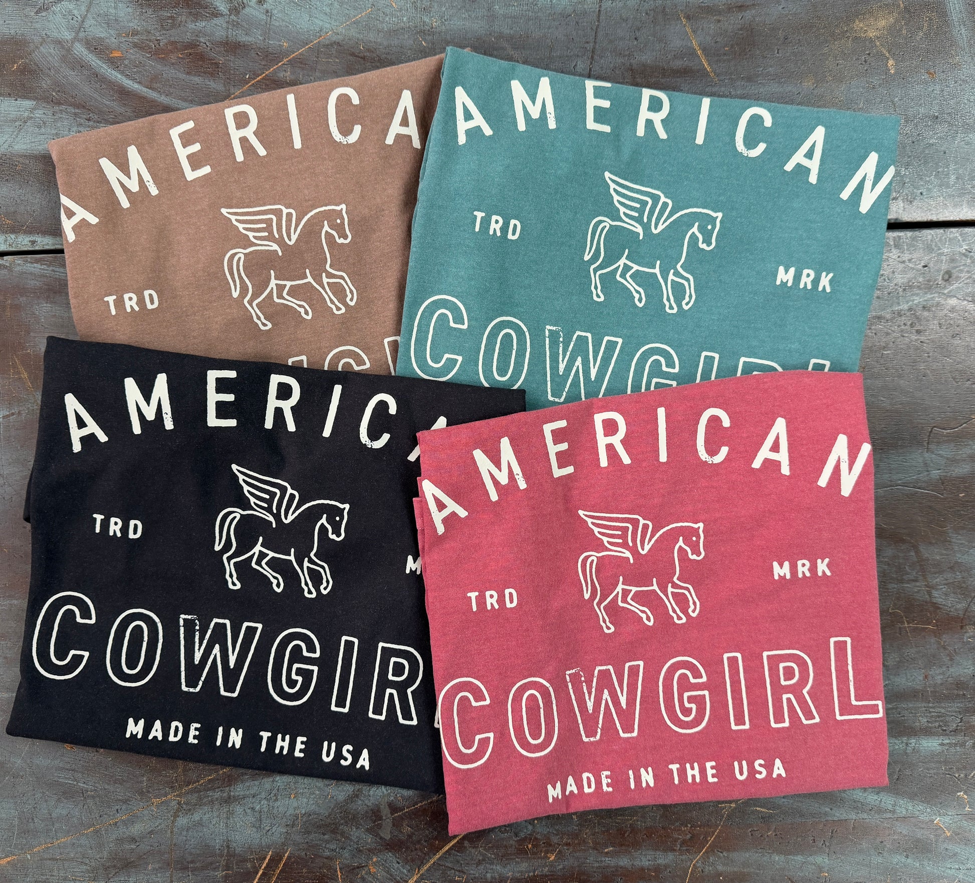 The American Cowgirl Tee is that effortless graphic you’ll reach for again and again. Featuring a vintage-inspired Pegasus horse graphic and bold typography, this tee blends western heritage with everyday comfort. It’s the perfect mix of laid-back and statement-making — whether you’re pairing it with denim, boots, or layering it under a jacket.