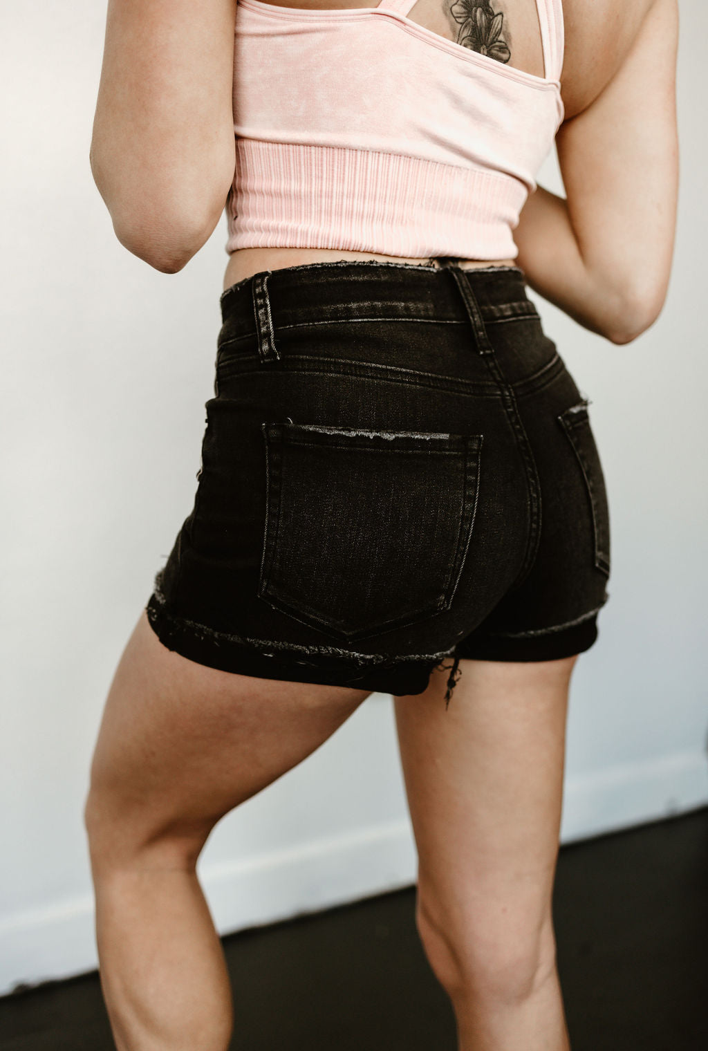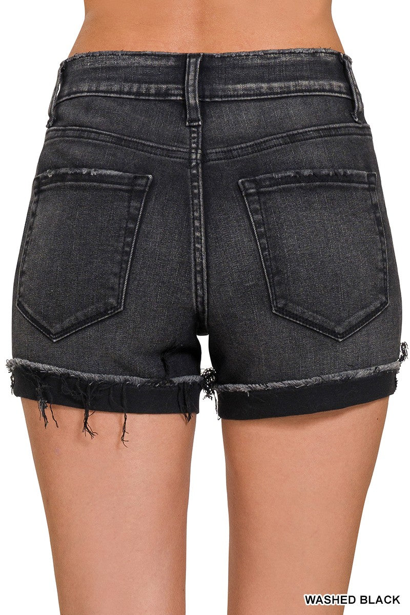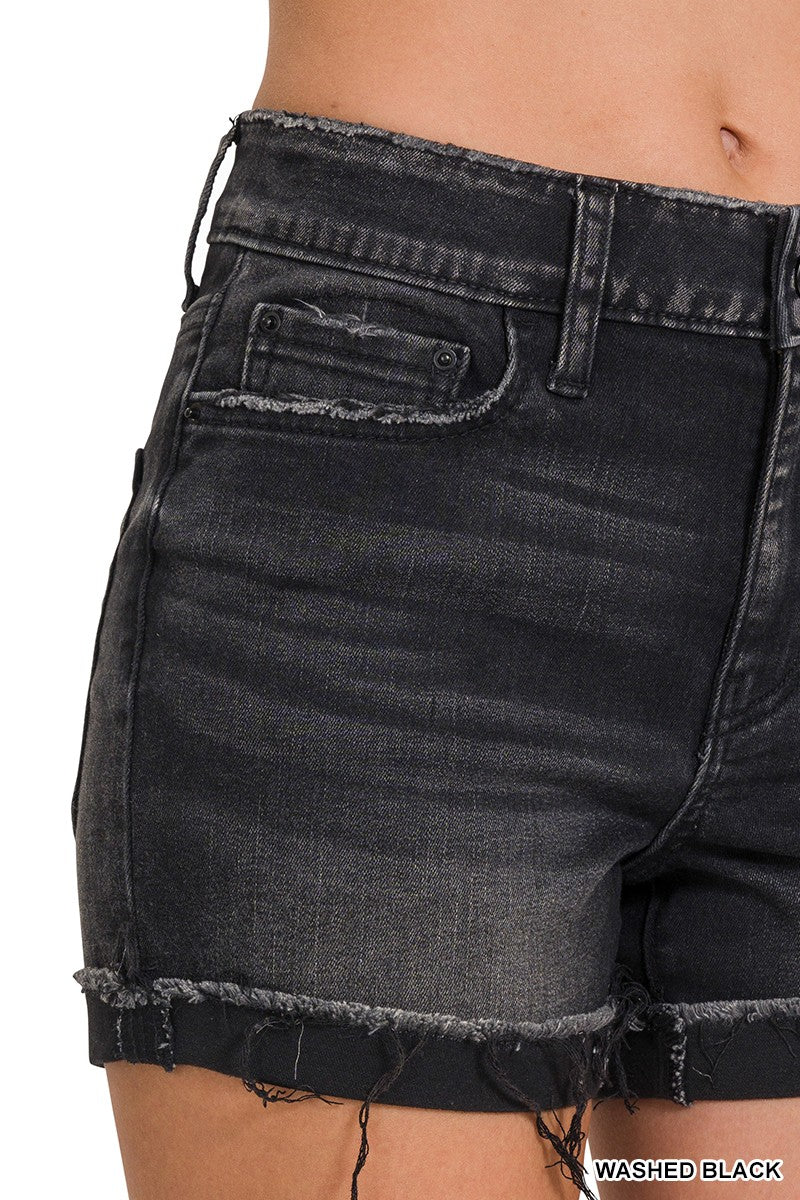 Elevate your summer wardrobe with our Black Raw Hem Denim Shorts. Made from a comfortable and durable fabric blend, these shorts feature a stylish folded raw hem and a zipper and button closure for a secure fit. With a front rise of 10" and an inseam of 3.75", they provide both style and practicality. Available in a washed black color, these shorts are perfect for any occasion. Complete your look by pairing them with your favorite top and sandals. Order now and rock the season with confidence!