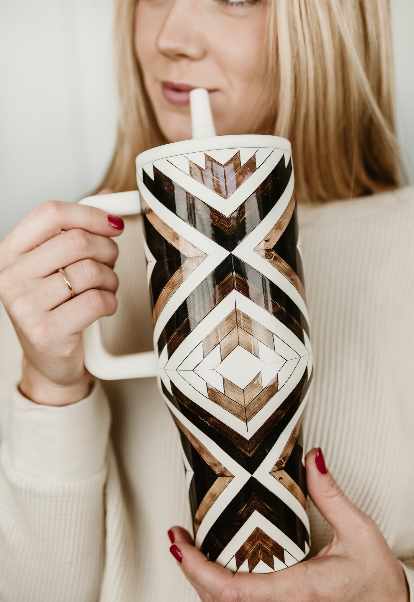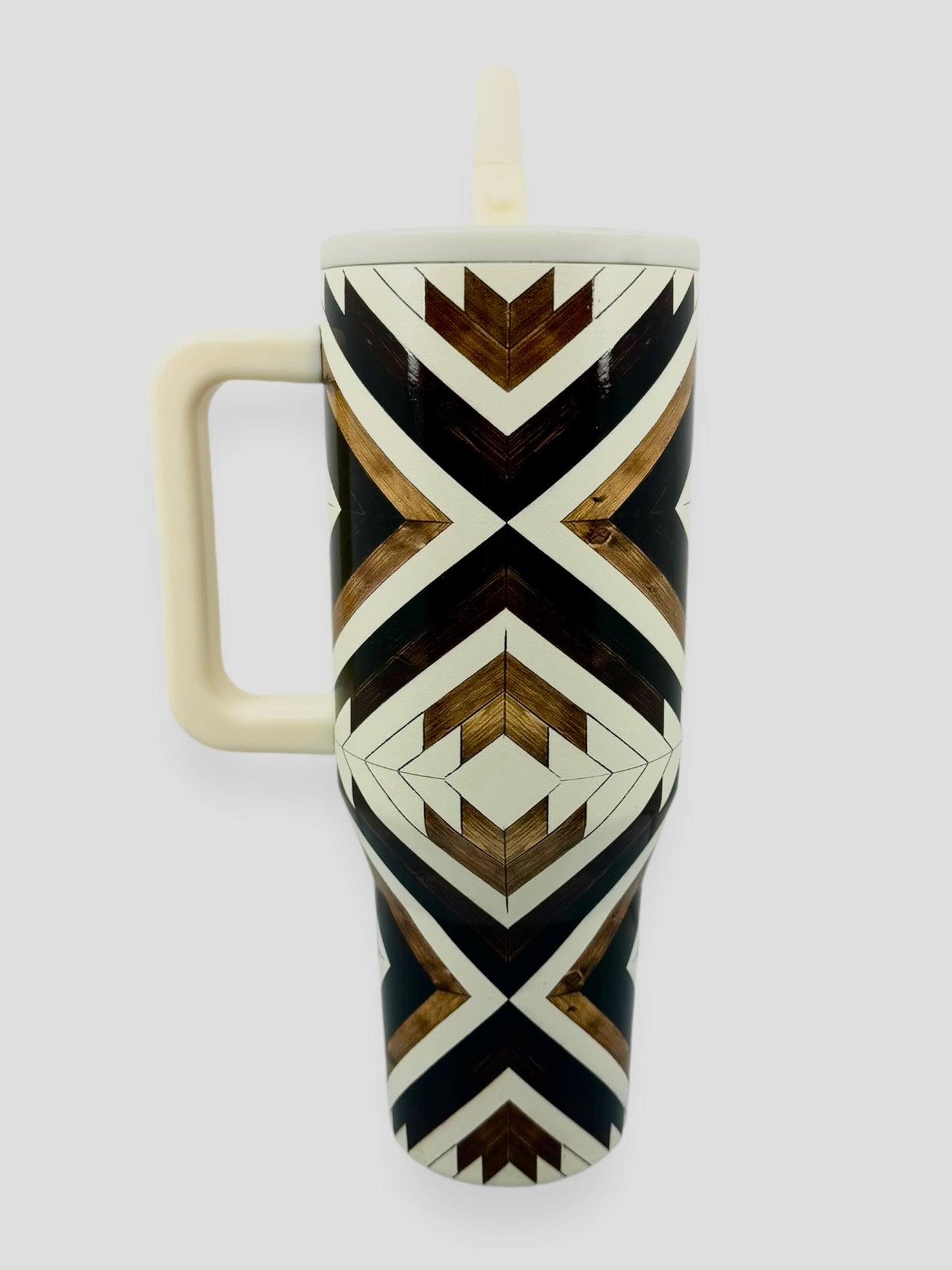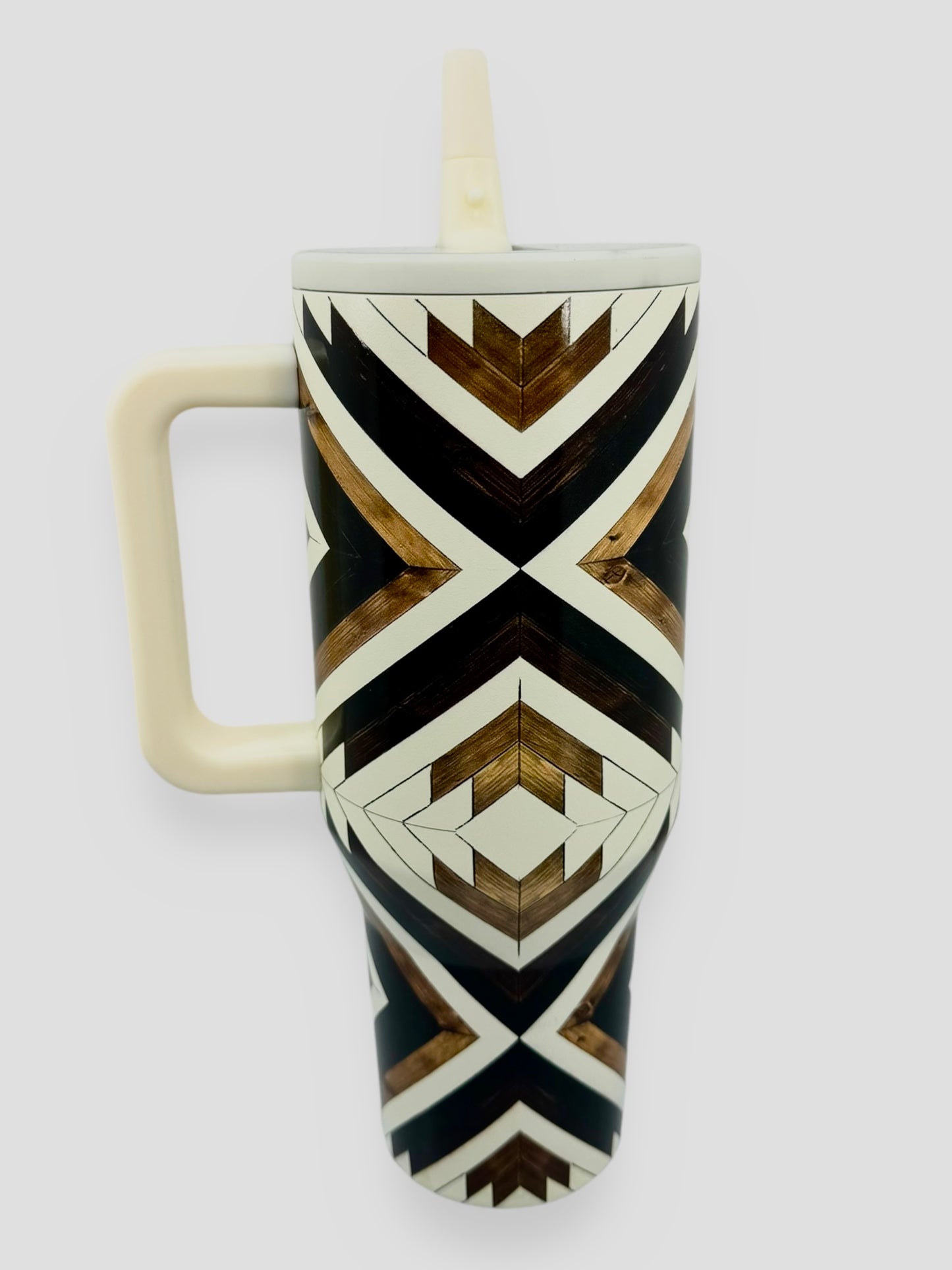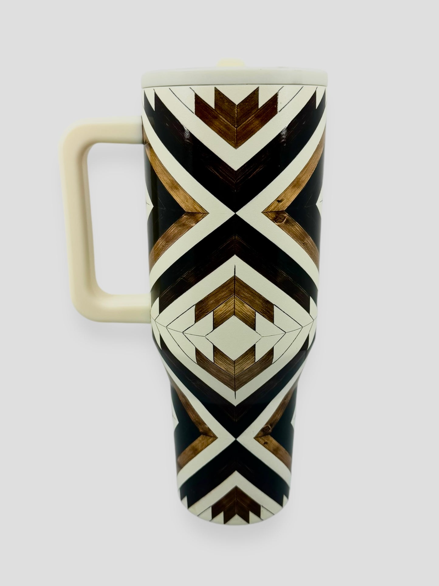 Elevate your hydration experience with the Desert Chevron Western 40oz Tumbler, meticulously crafted for both style and functionality. This robust tumbler showcases an eye-catching chevron design inspired by western aesthetics, featuring contrasting dark and light wood tones that make it a standout piece.