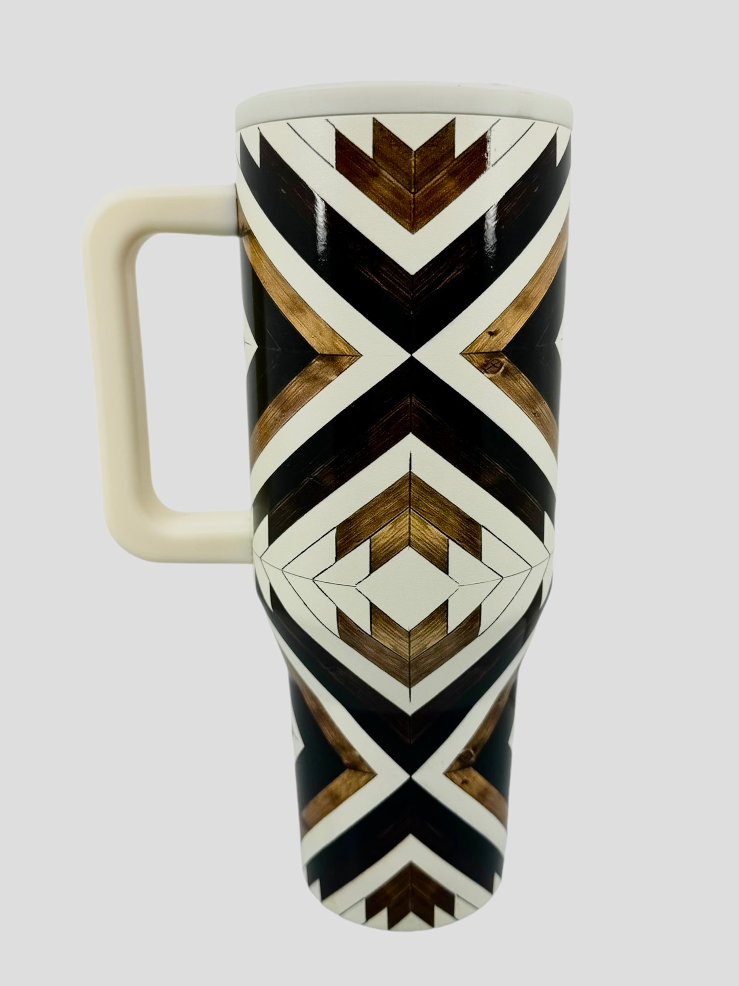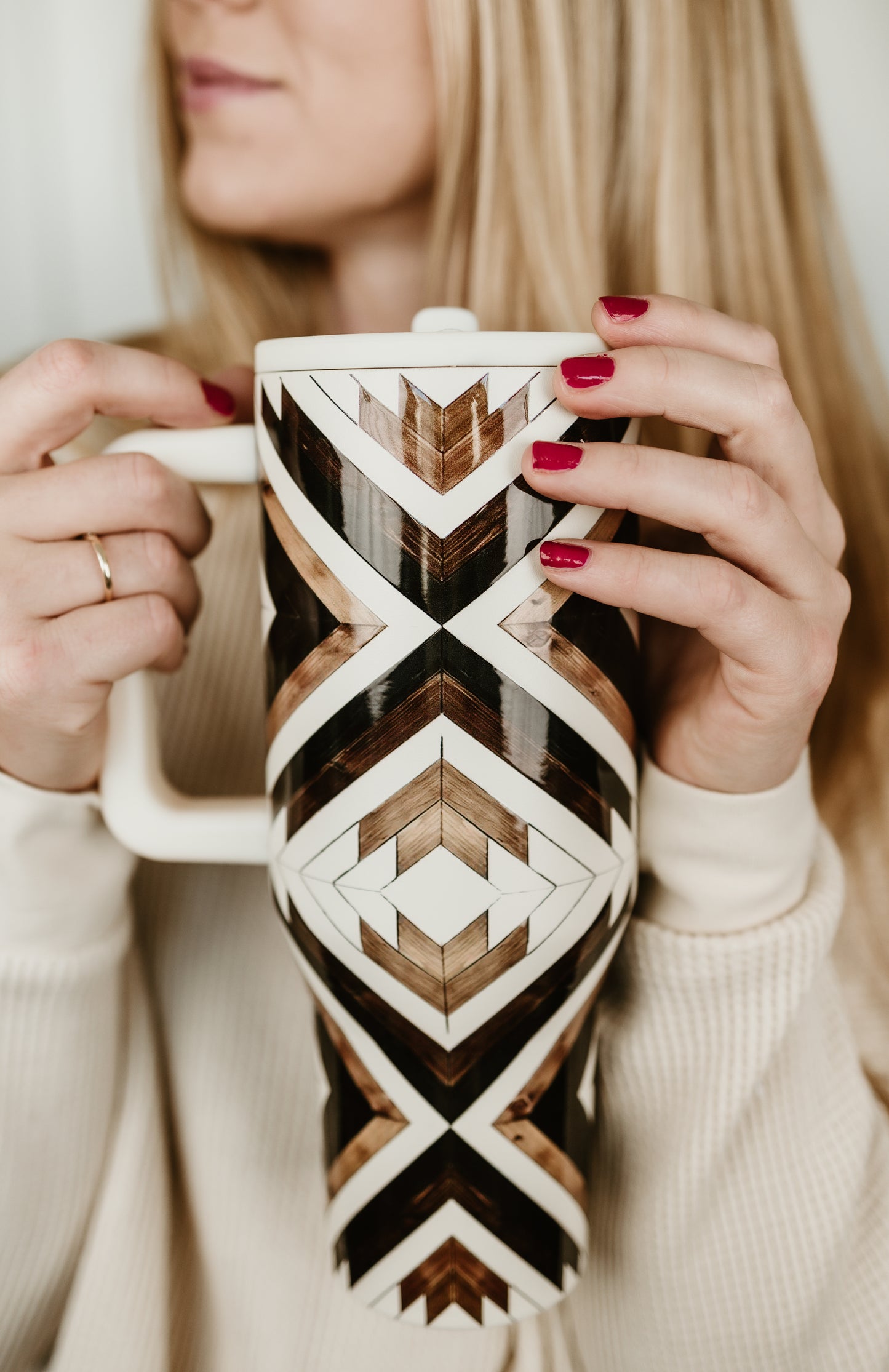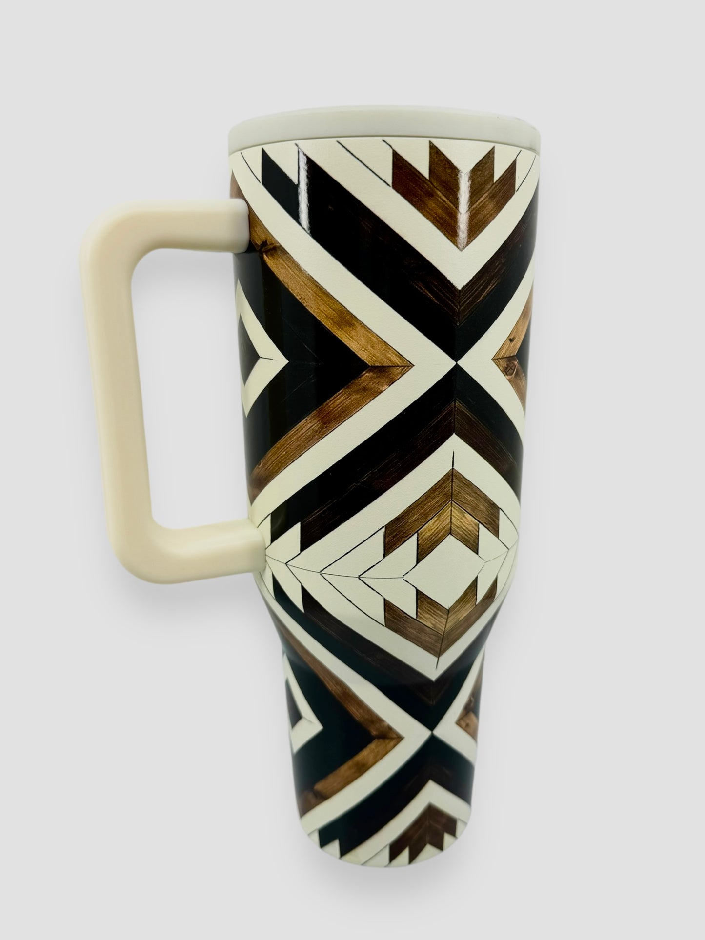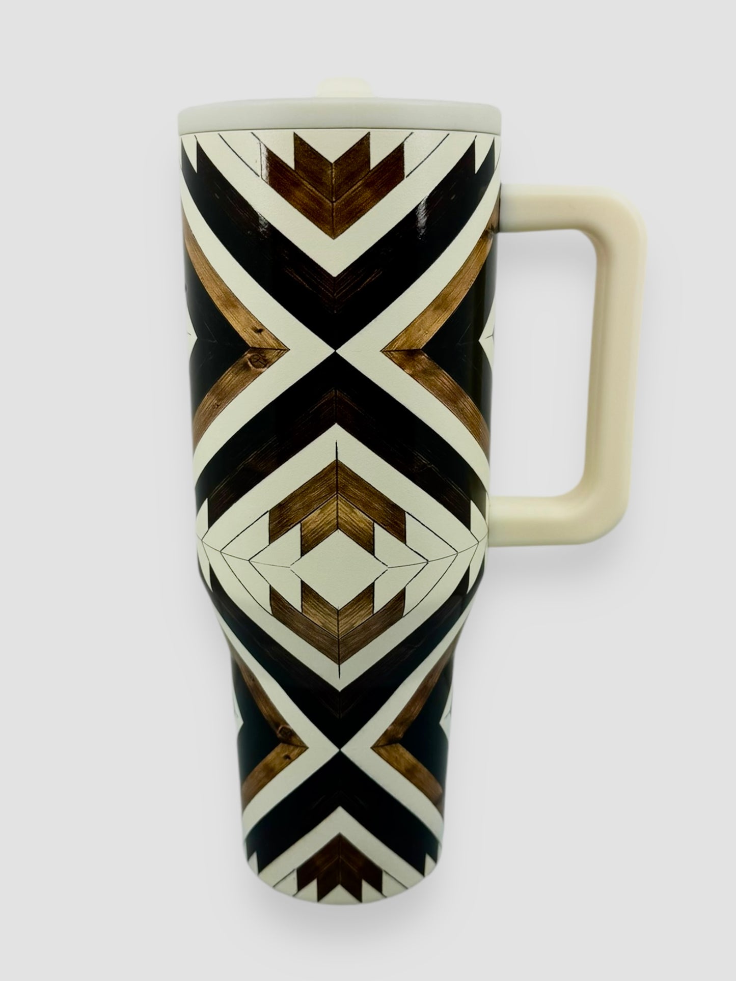 Elevate your hydration experience with the Desert Chevron Western 40oz Tumbler, meticulously crafted for both style and functionality. This robust tumbler showcases an eye-catching chevron design inspired by western aesthetics, featuring contrasting dark and light wood tones that make it a standout piece.