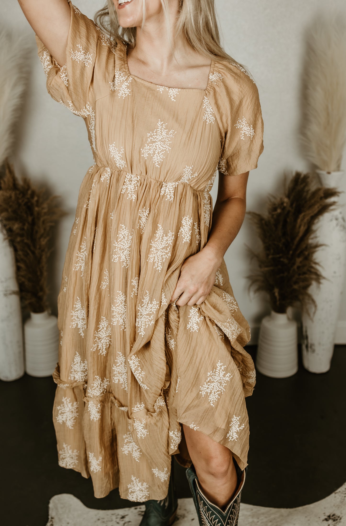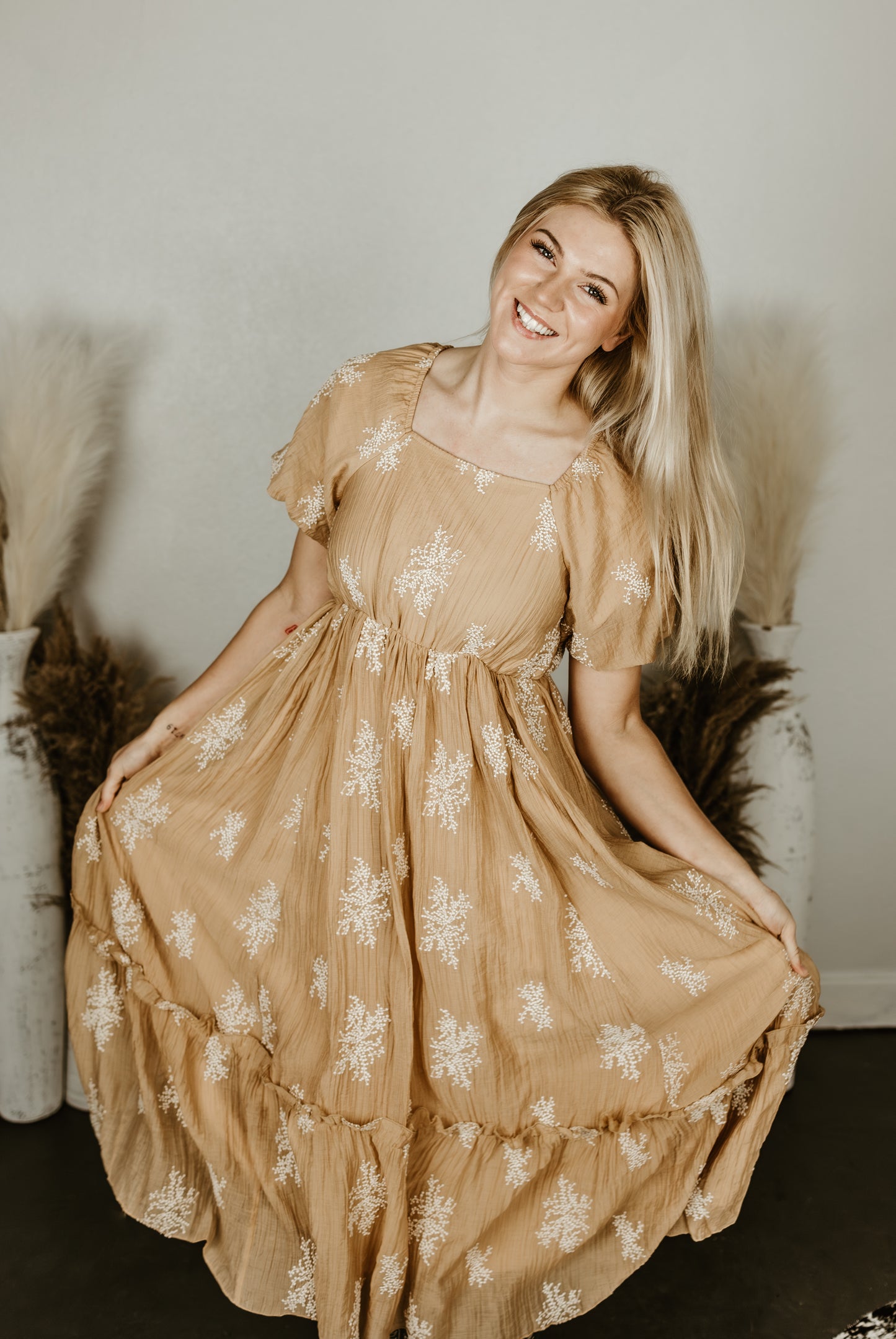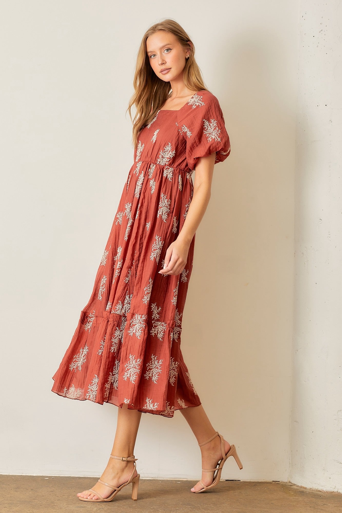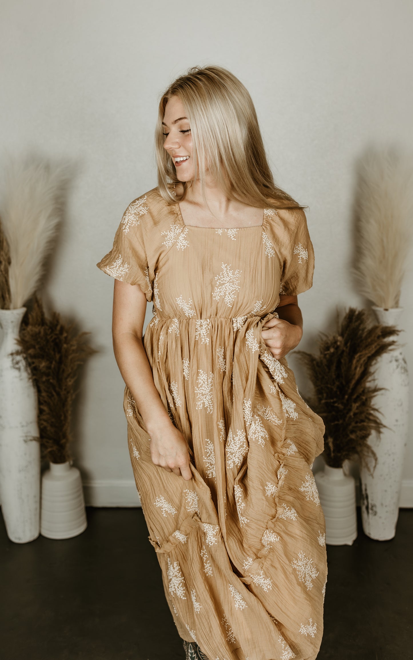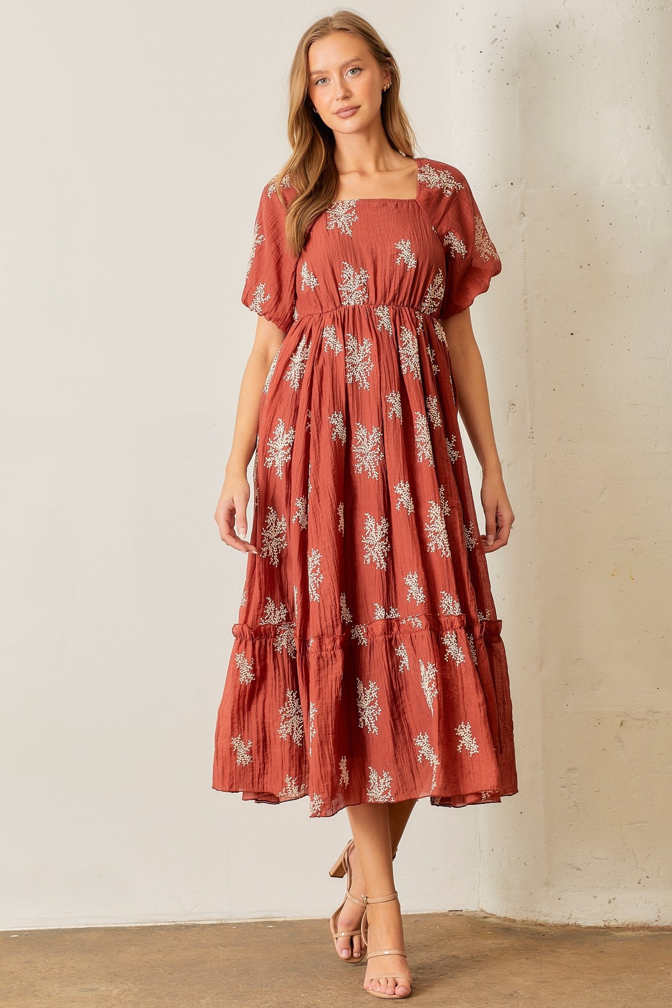 This embroidered sleeve maxi dress features a square neck and short sleeves for a stylish and comfortable fit. Made with a blend of 80% polyester and 20% Tencel, this dress offers both durability and softness. Perfect for any occasion, this dress is a must-have for your wardrobe.