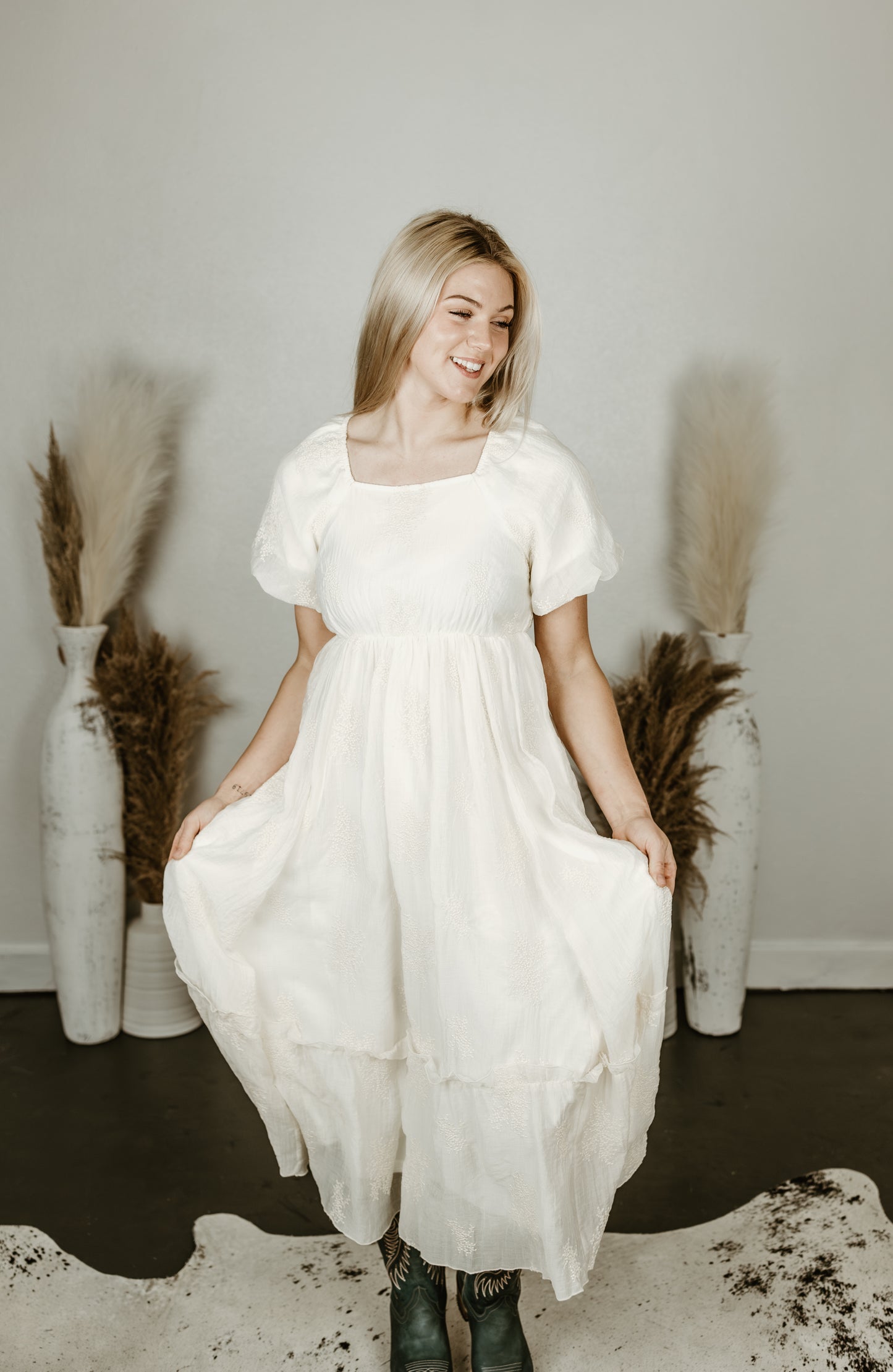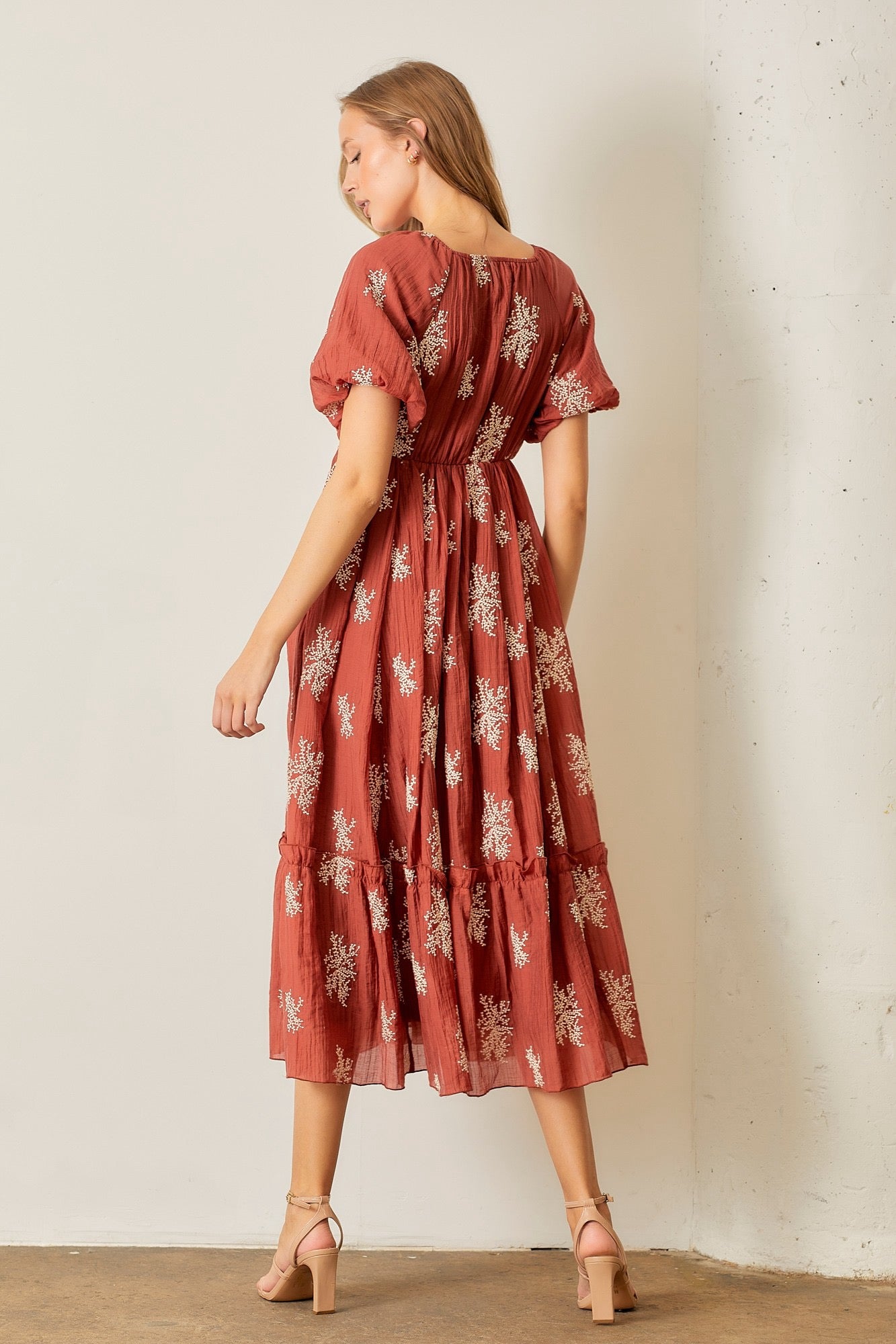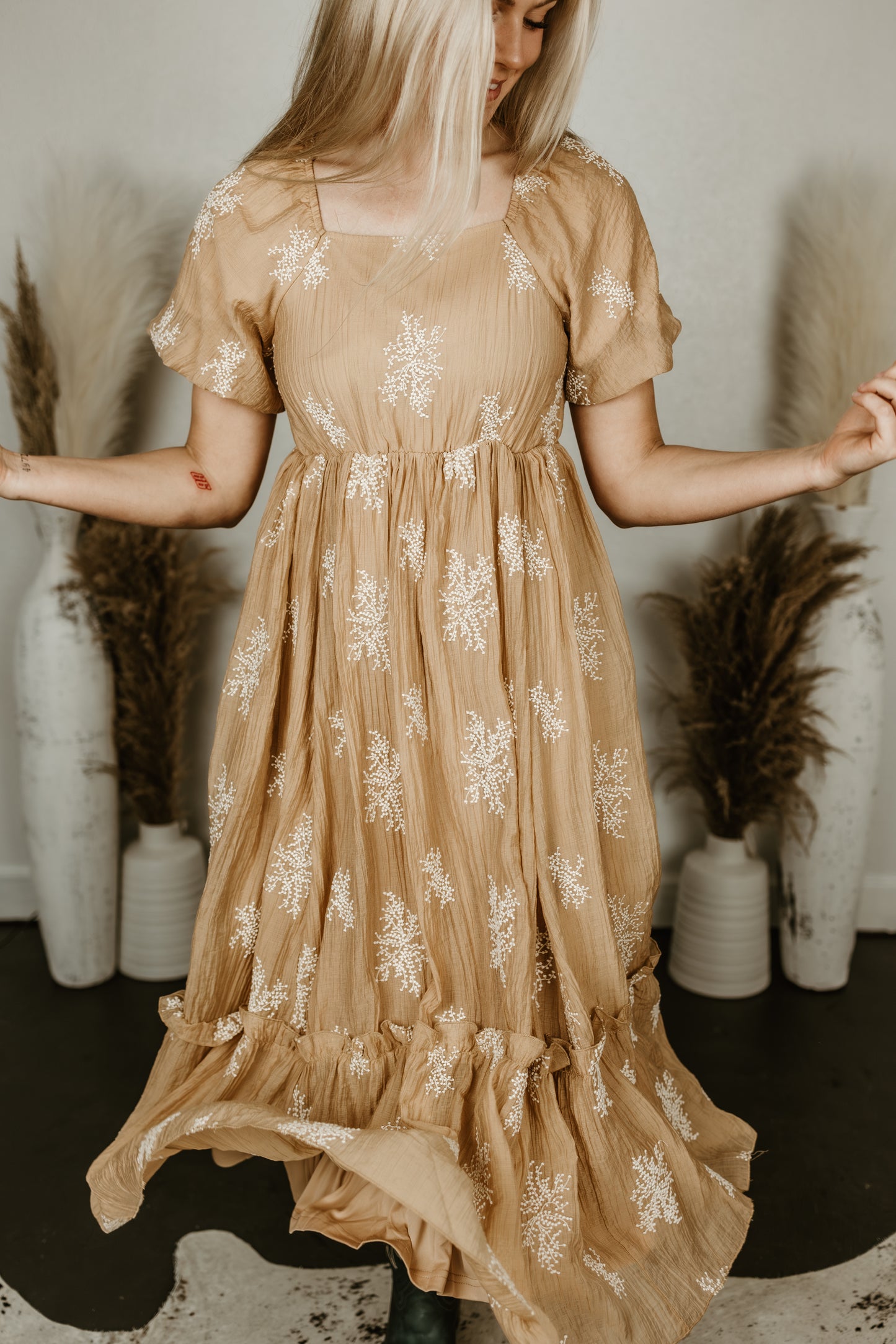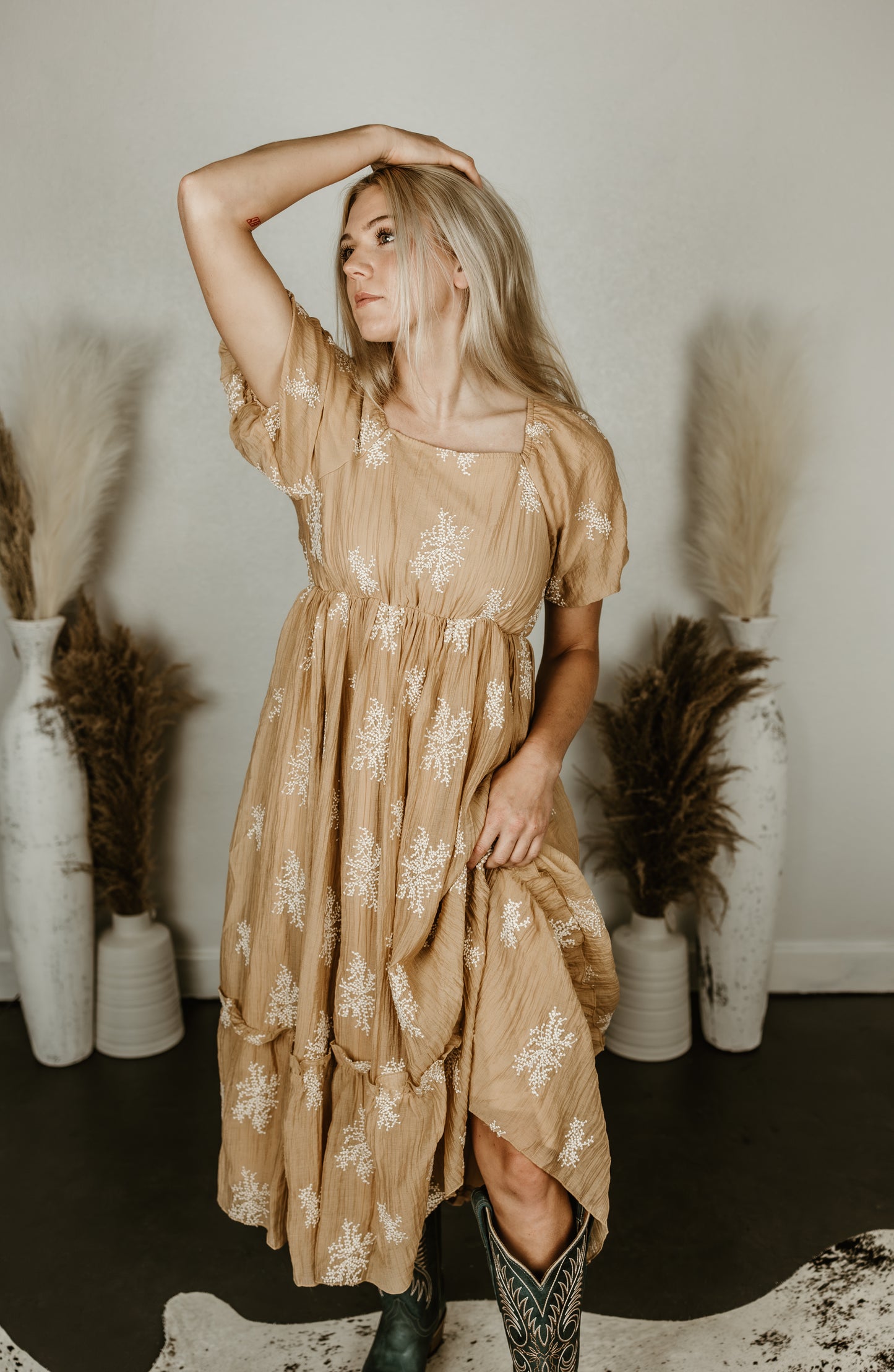 This embroidered sleeve maxi dress features a square neck and short sleeves for a stylish and comfortable fit. Made with a blend of 80% polyester and 20% Tencel, this dress offers both durability and softness. Perfect for any occasion, this dress is a must-have for your wardrobe.