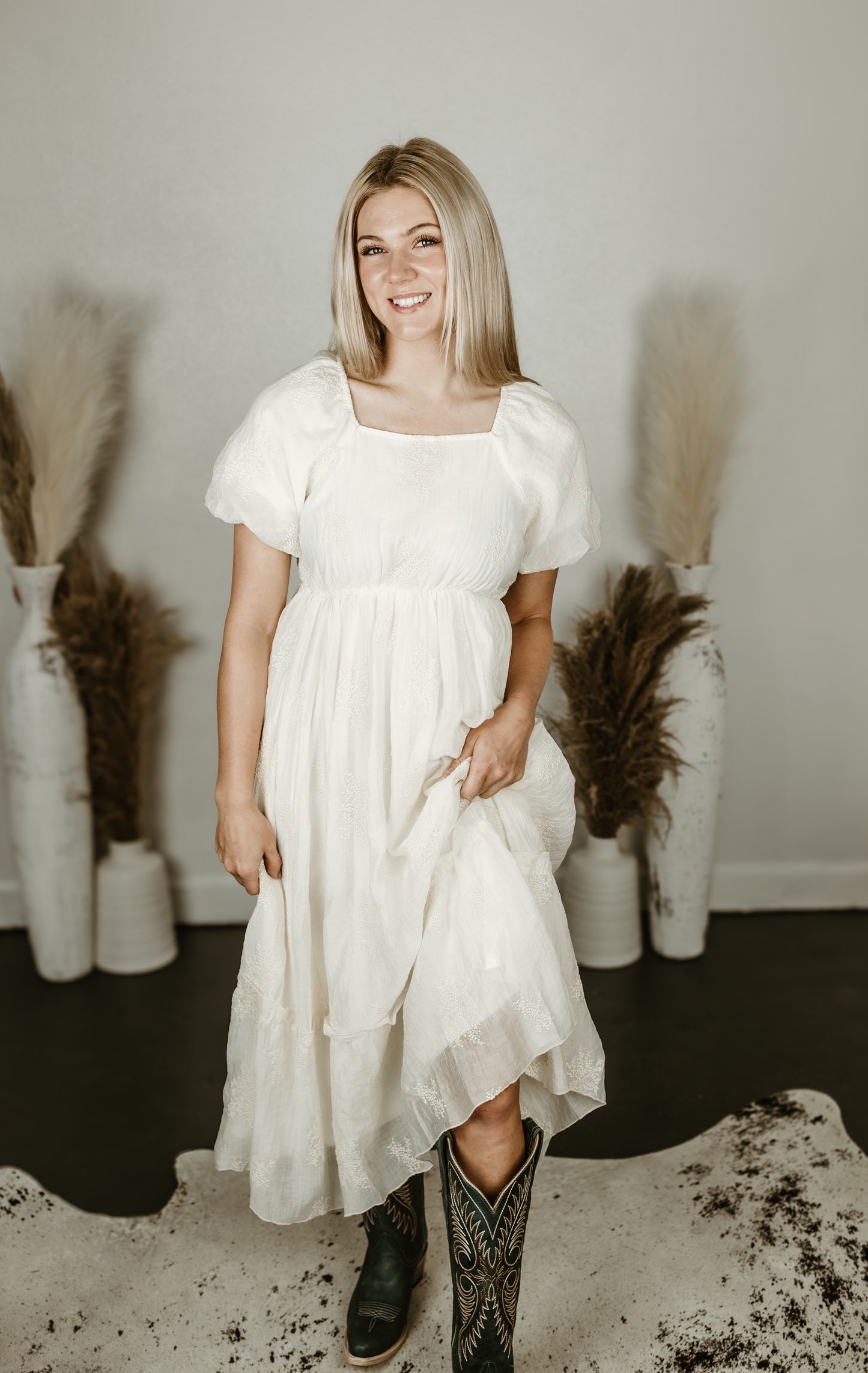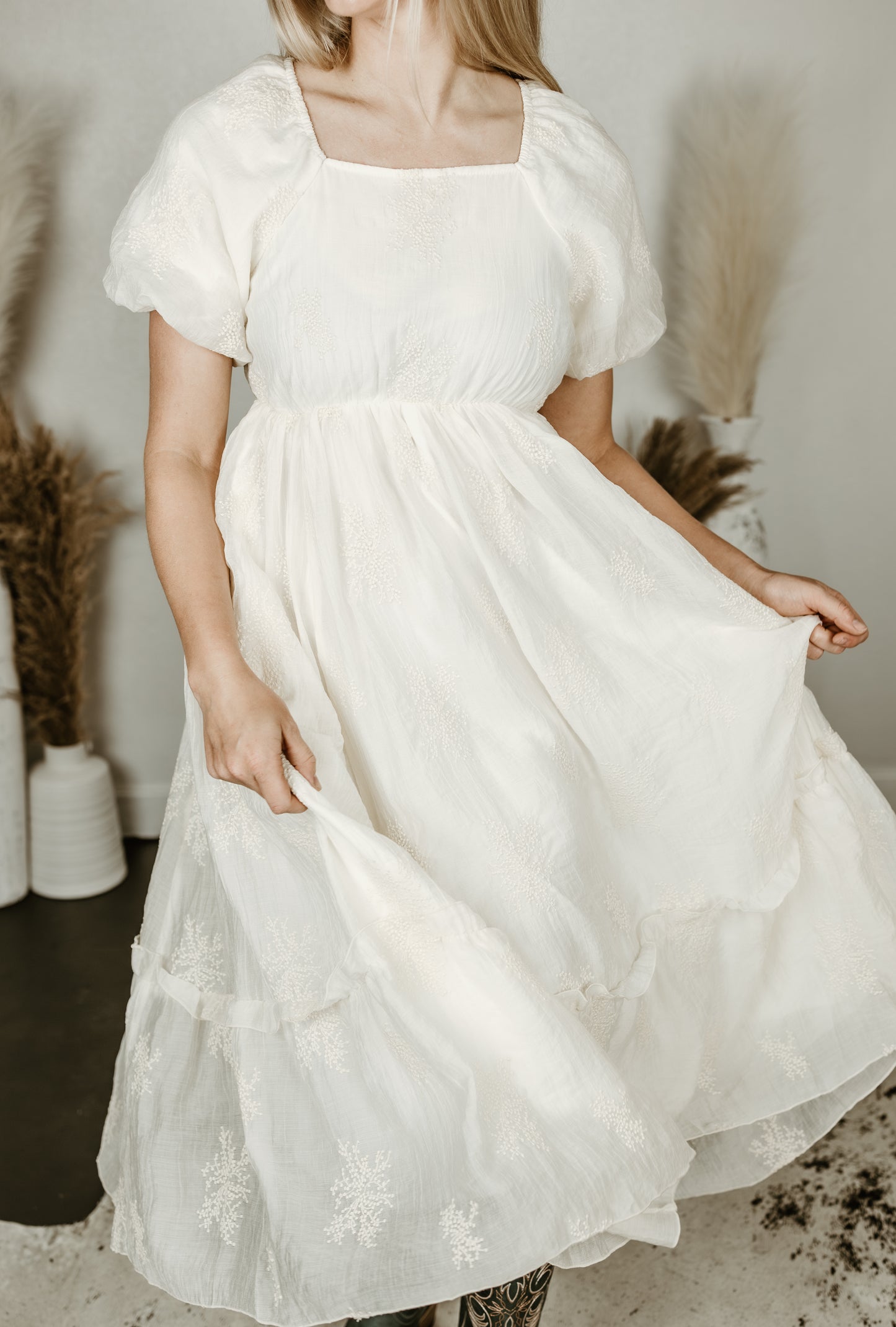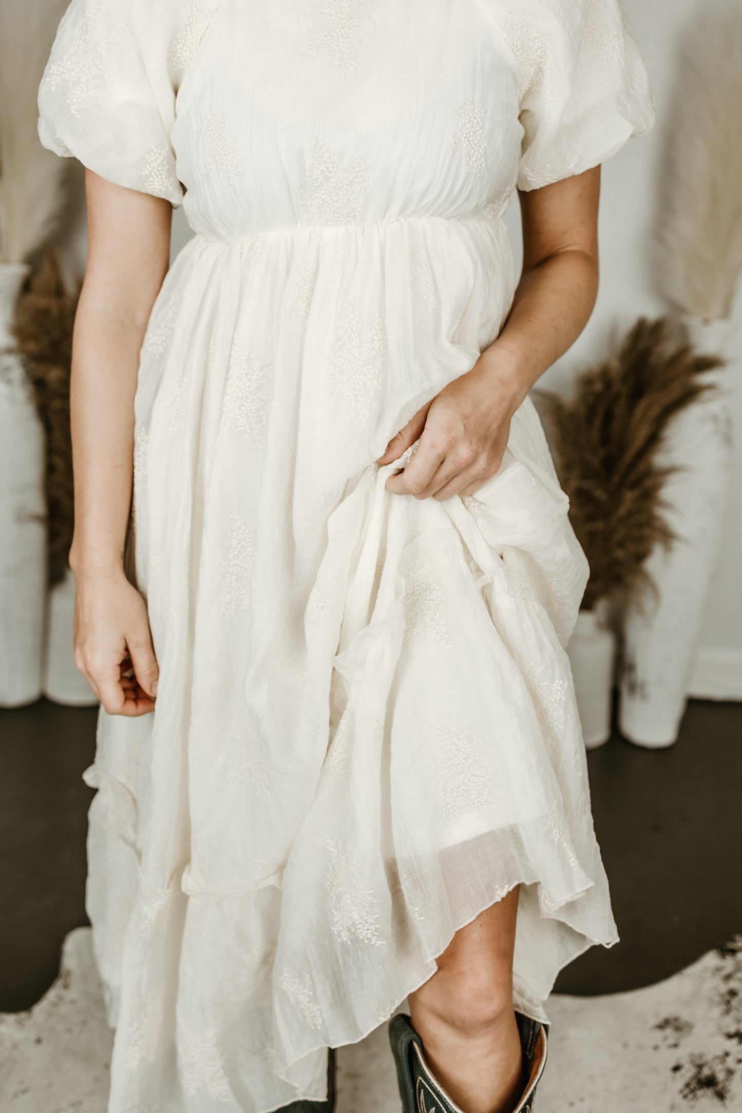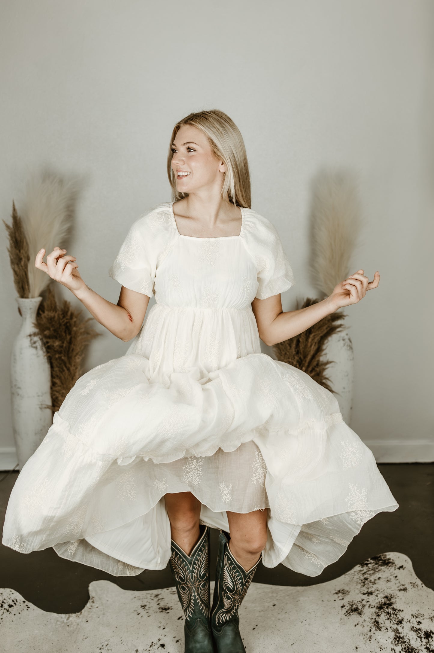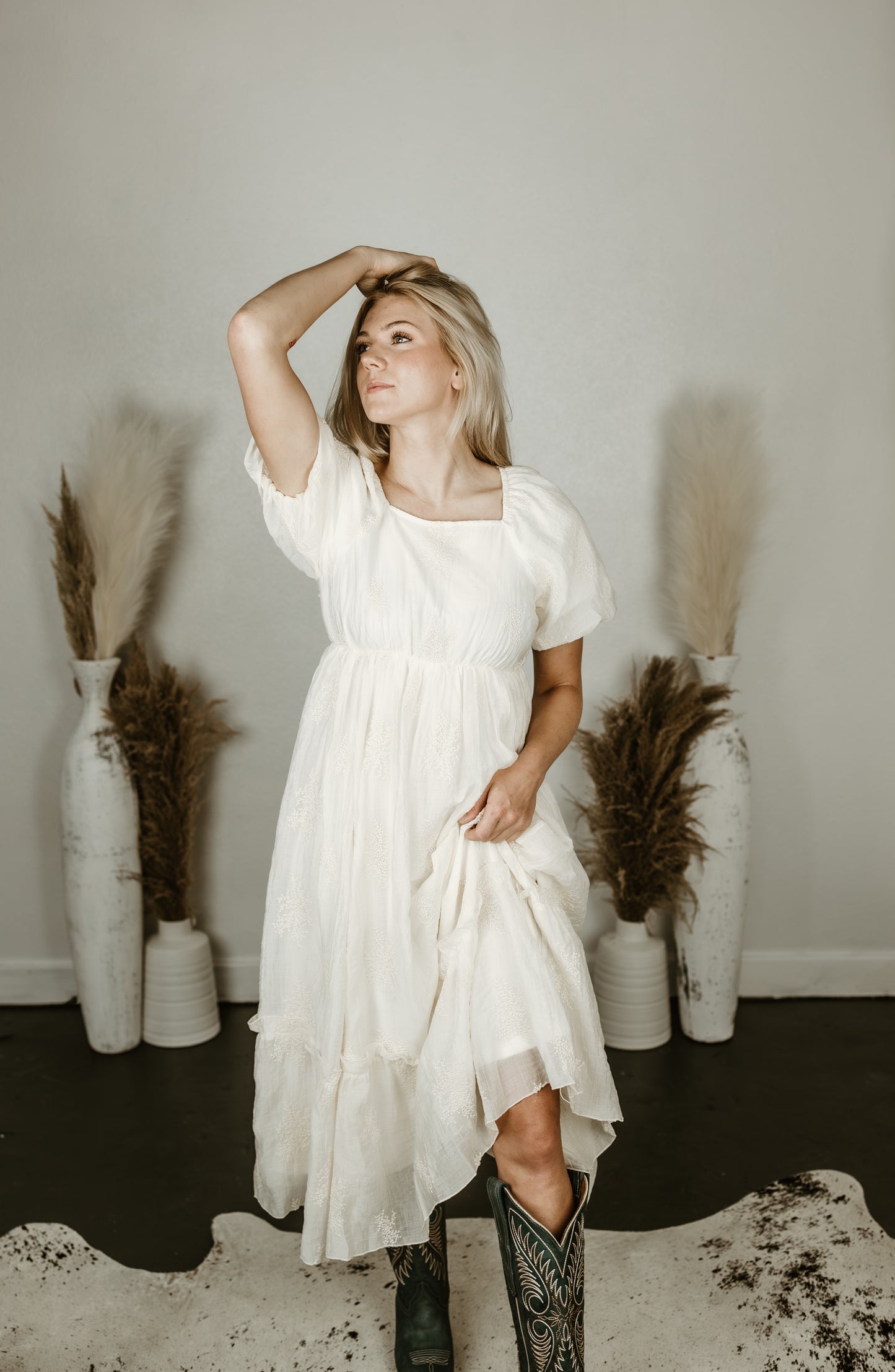This embroidered sleeve maxi dress features a square neck and short sleeves for a stylish and comfortable fit. Made with a blend of 80% polyester and 20% Tencel, this dress offers both durability and softness. Perfect for any occasion, this dress is a must-have for your wardrobe.