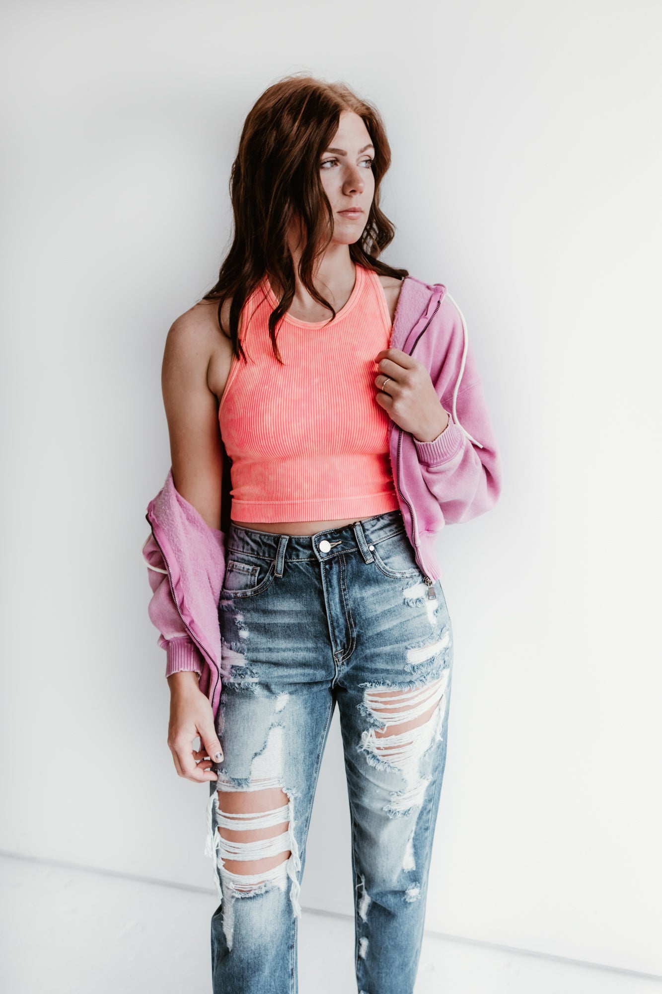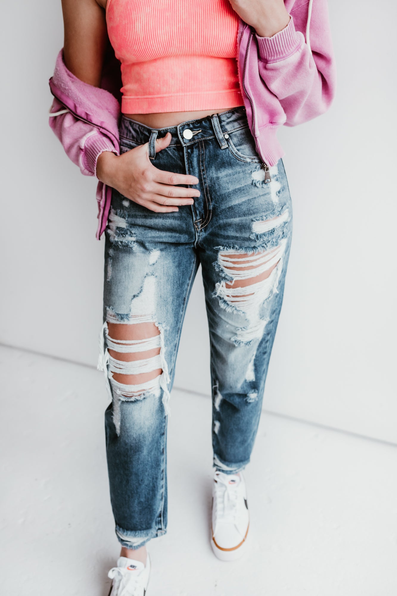Our Harvie High Waisted Boyfriend Jeans offer all-day comfort and style with a high waist, straight leg, and heavy destroyed finish.
