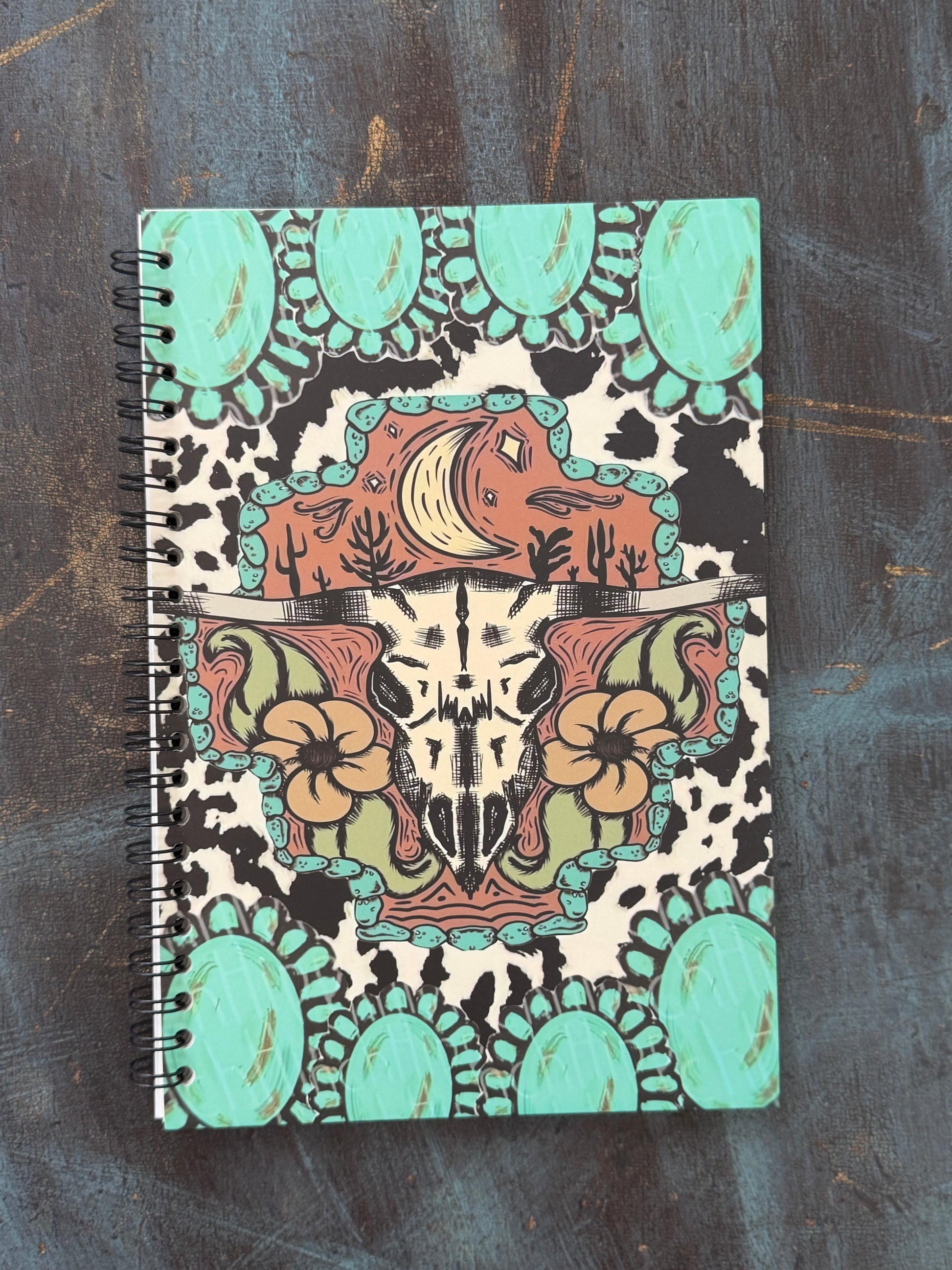 This 8.5” x 6” western spiral notebook features a bold cowhide print background, turquoise stone-inspired border detailing, and a stunning western skull centerpiece with desert and floral accents. It’s the perfect mix of rugged and feminine — just how we like it.