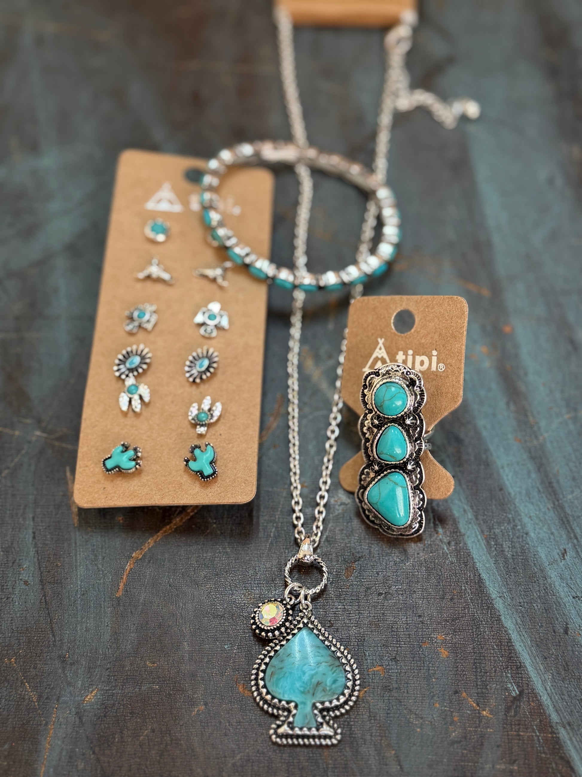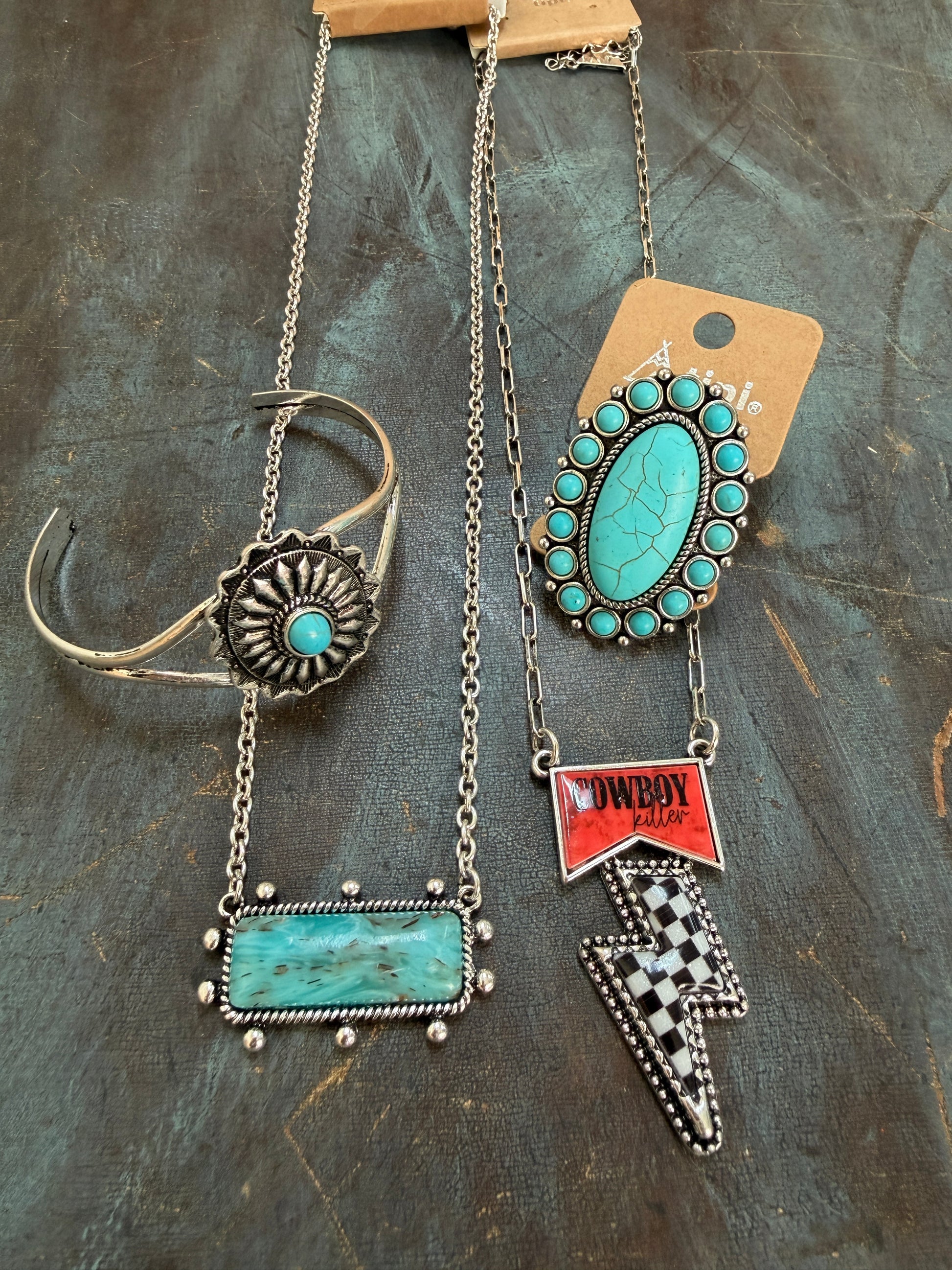 These are fashion jewelry pieces (not genuine turquoise) featuring western-inspired details like faux turquoise stones, silver-tone finishes, checker accents, desert motifs, and bold southwestern flair.
