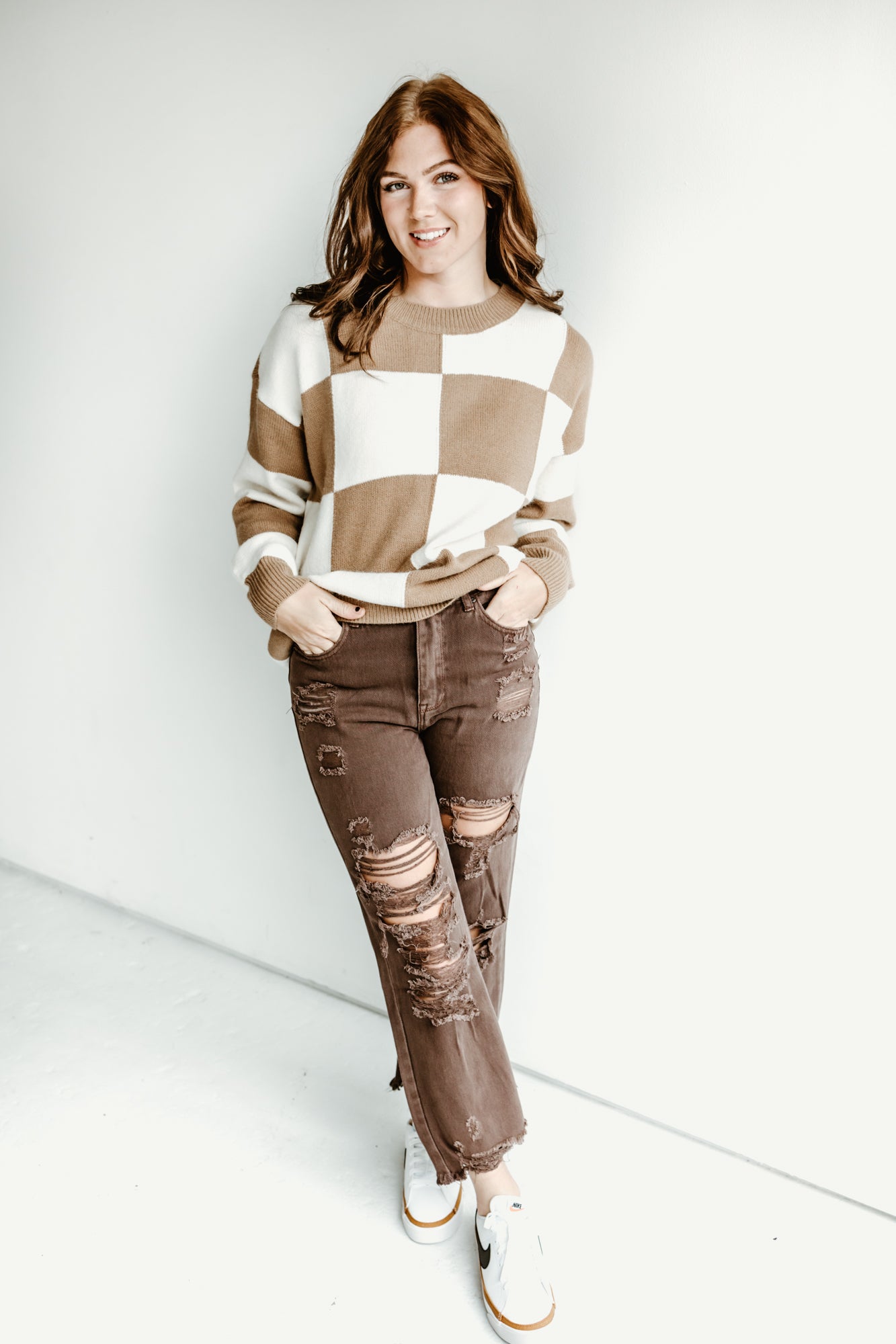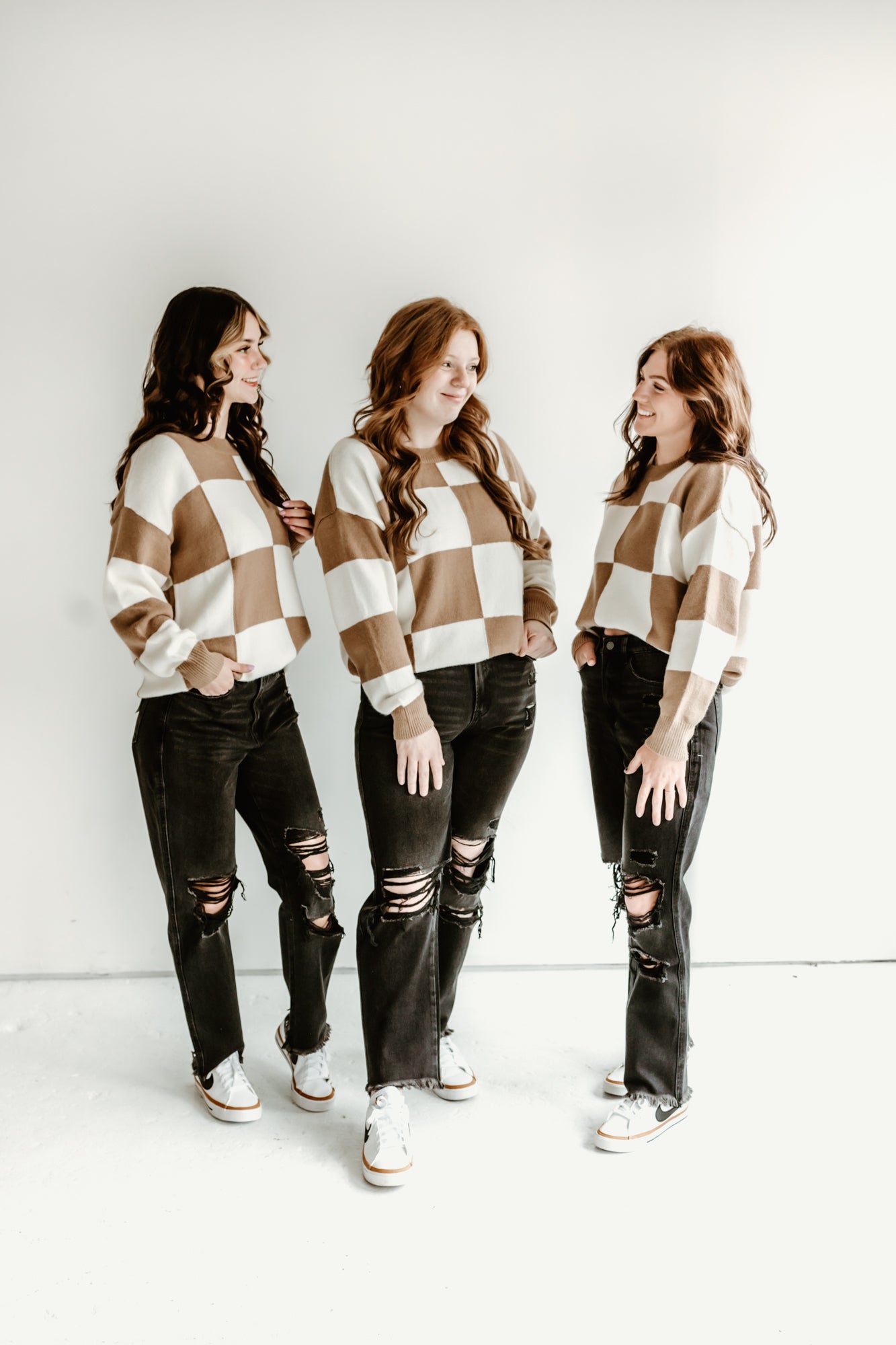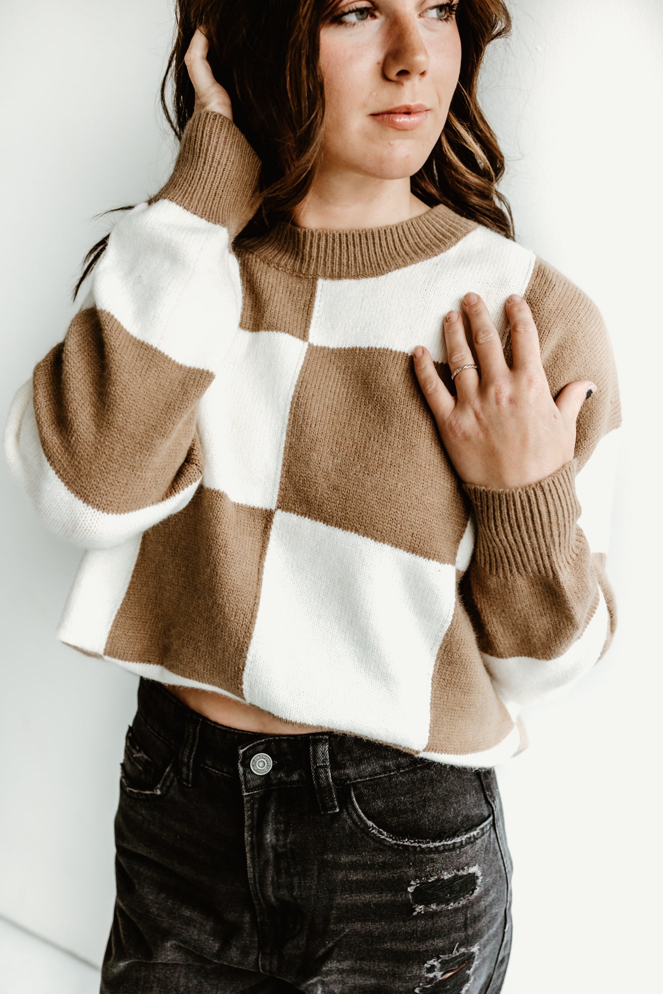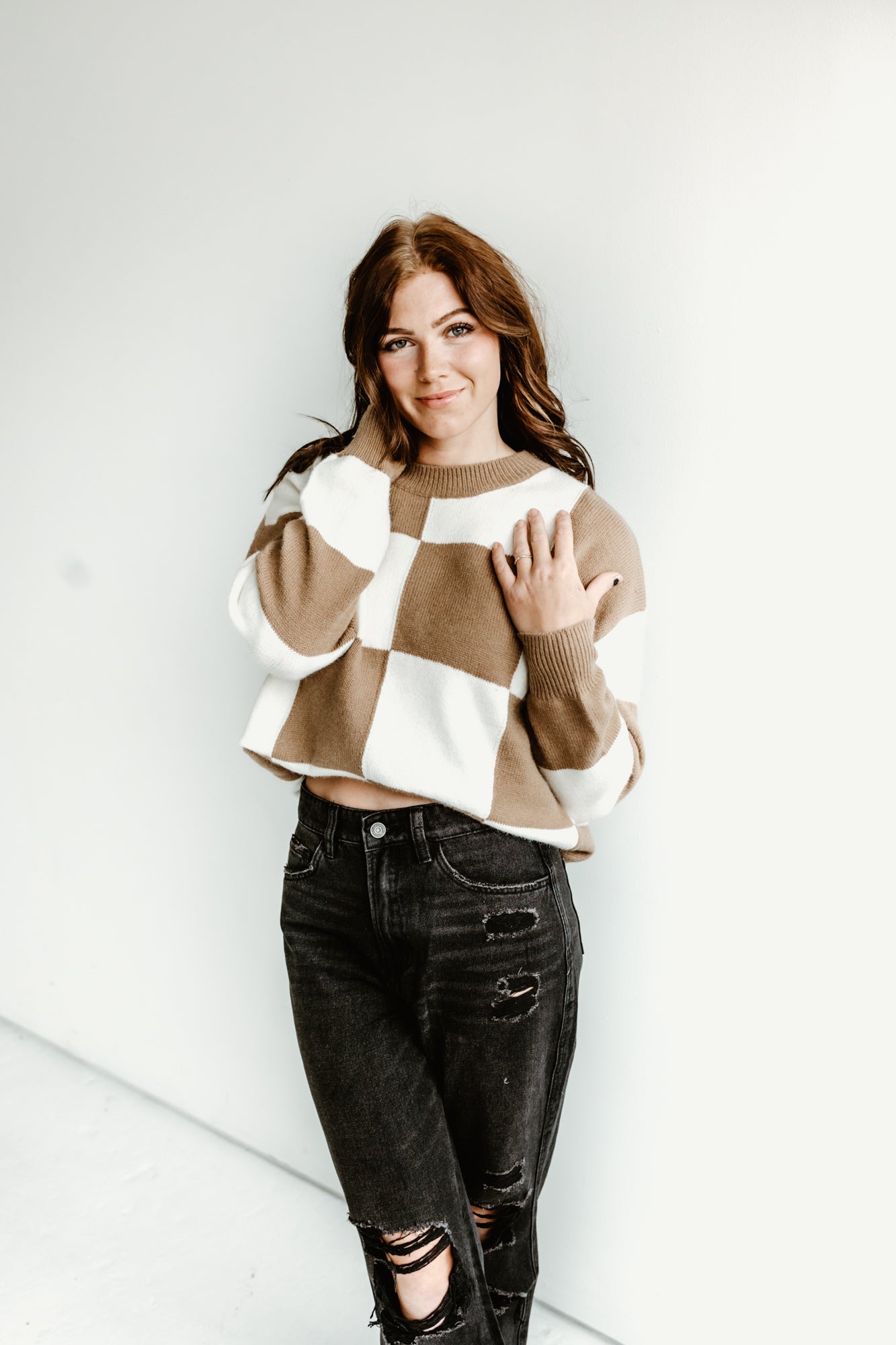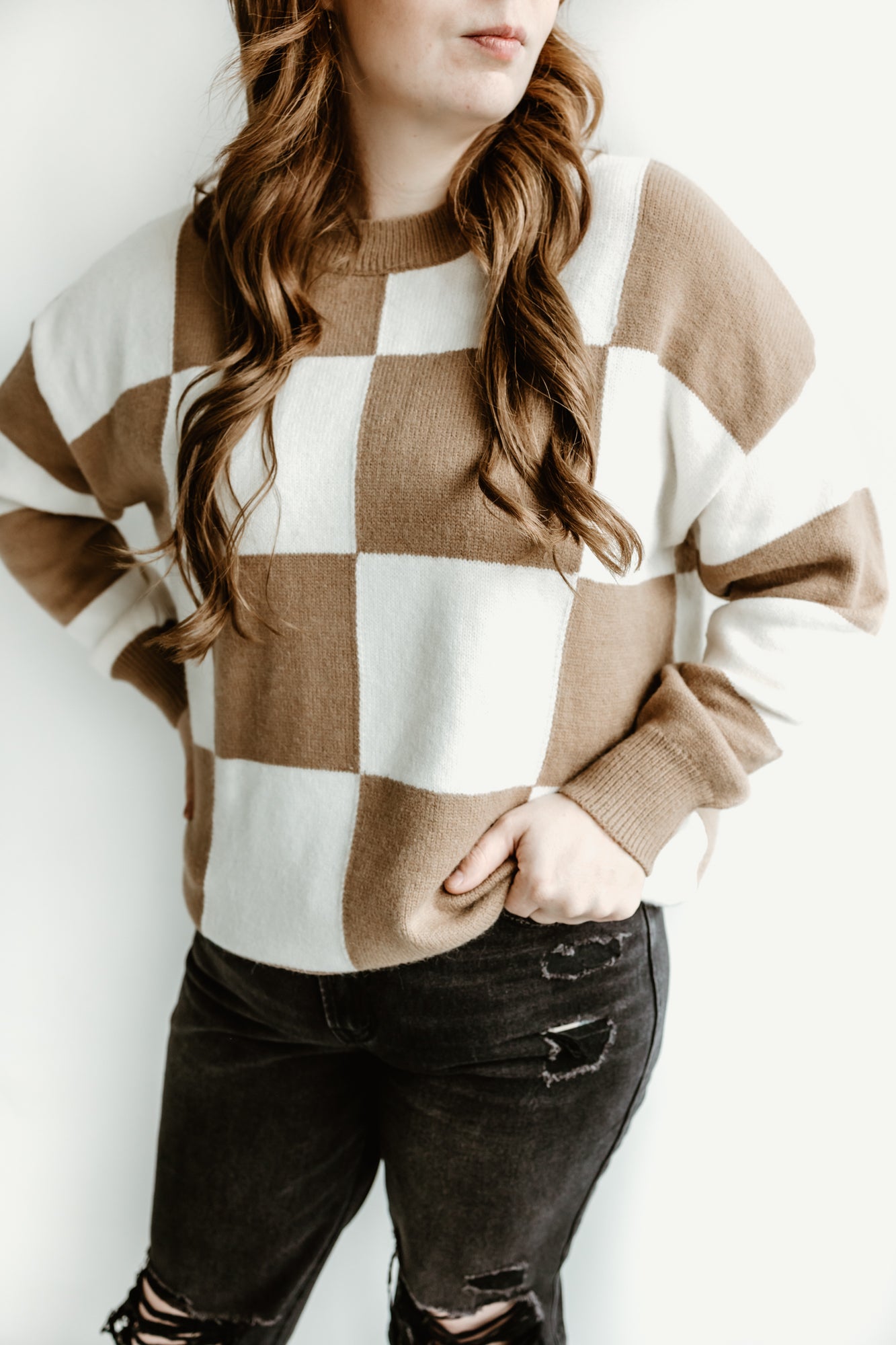 Our Classic Checker Round Neck Sweater is carefully crafted from super soft checkered brown and white fabric for a look that will transition seamlessly into fall. Wear it tucked in or loose for a cozy yet stylish look.slightly oversized wear