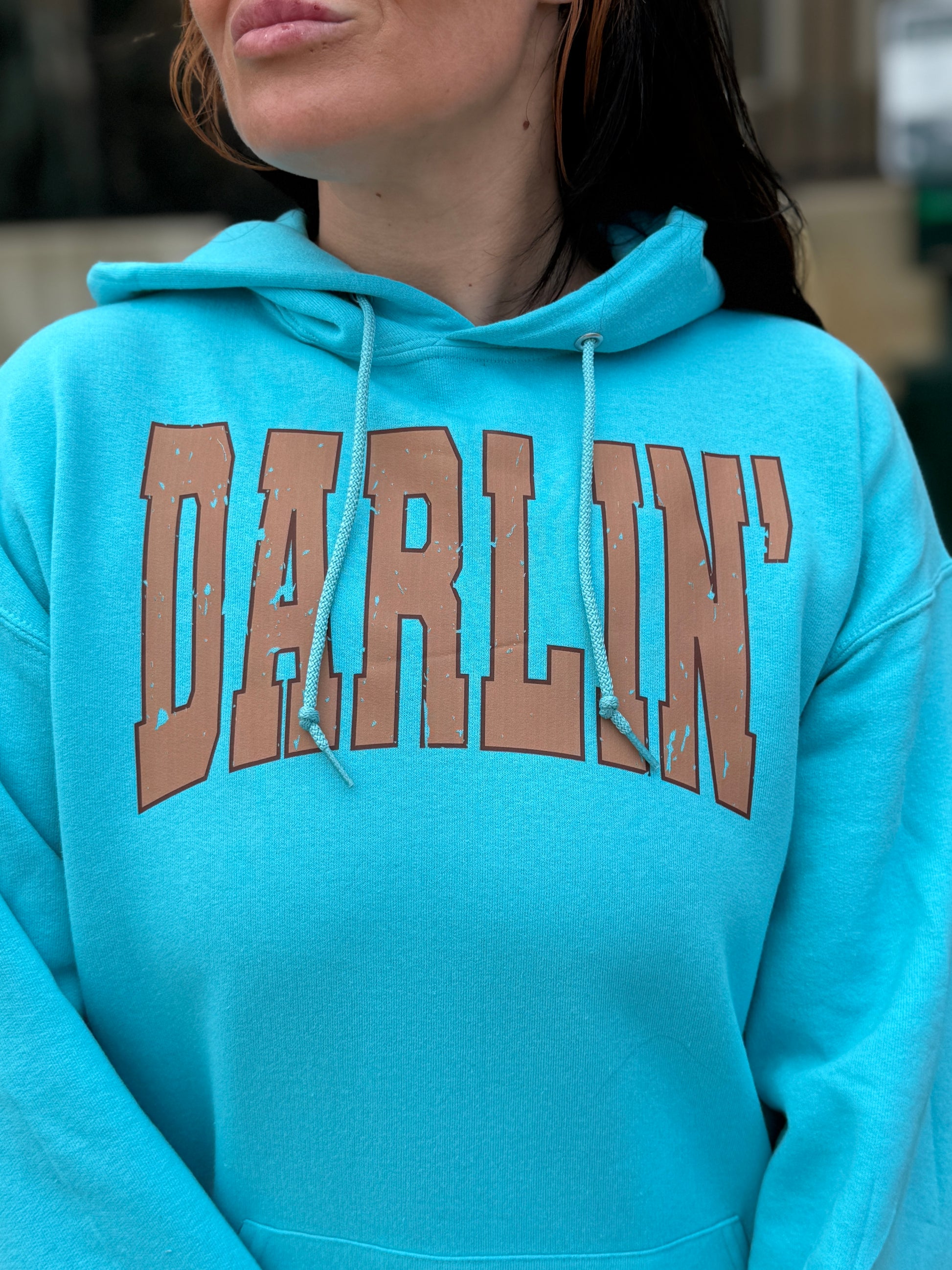 Turn heads with comfort and confidence in the Darlin’ Signature Hoodie by Dani Morgans. Crafted for cozy durability and everyday wear, this hoodie blends 50/50 cotton-polyester NuBlend® fleece for a buttery-soft feel that resists pilling and keeps its shape. The vibrant turquoise color pops with bold “DARLIN’” lettering across the chest and is finished with the iconic Dani Morgans longhorn logo on the sleeve—adding a touch of western charm to your streetwear.