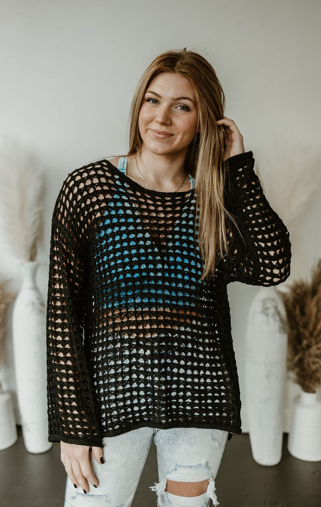 Add a playful touch to your wardrobe with the Lainey Oversized Crochet Pullover! Featuring a boat neck, long sleeves, and a drop shoulder, this solid crochet knit sweater can be dressed up or down for any occasion. Made with 65% acrylic and 35% nylon and not lined, it's both stylish and comfortable.