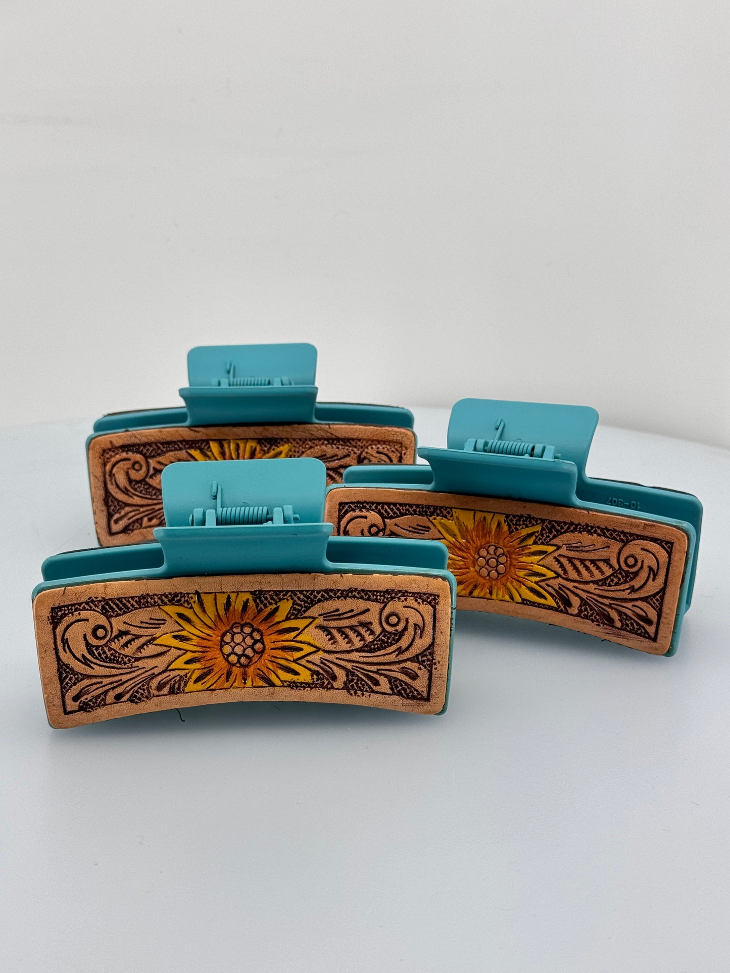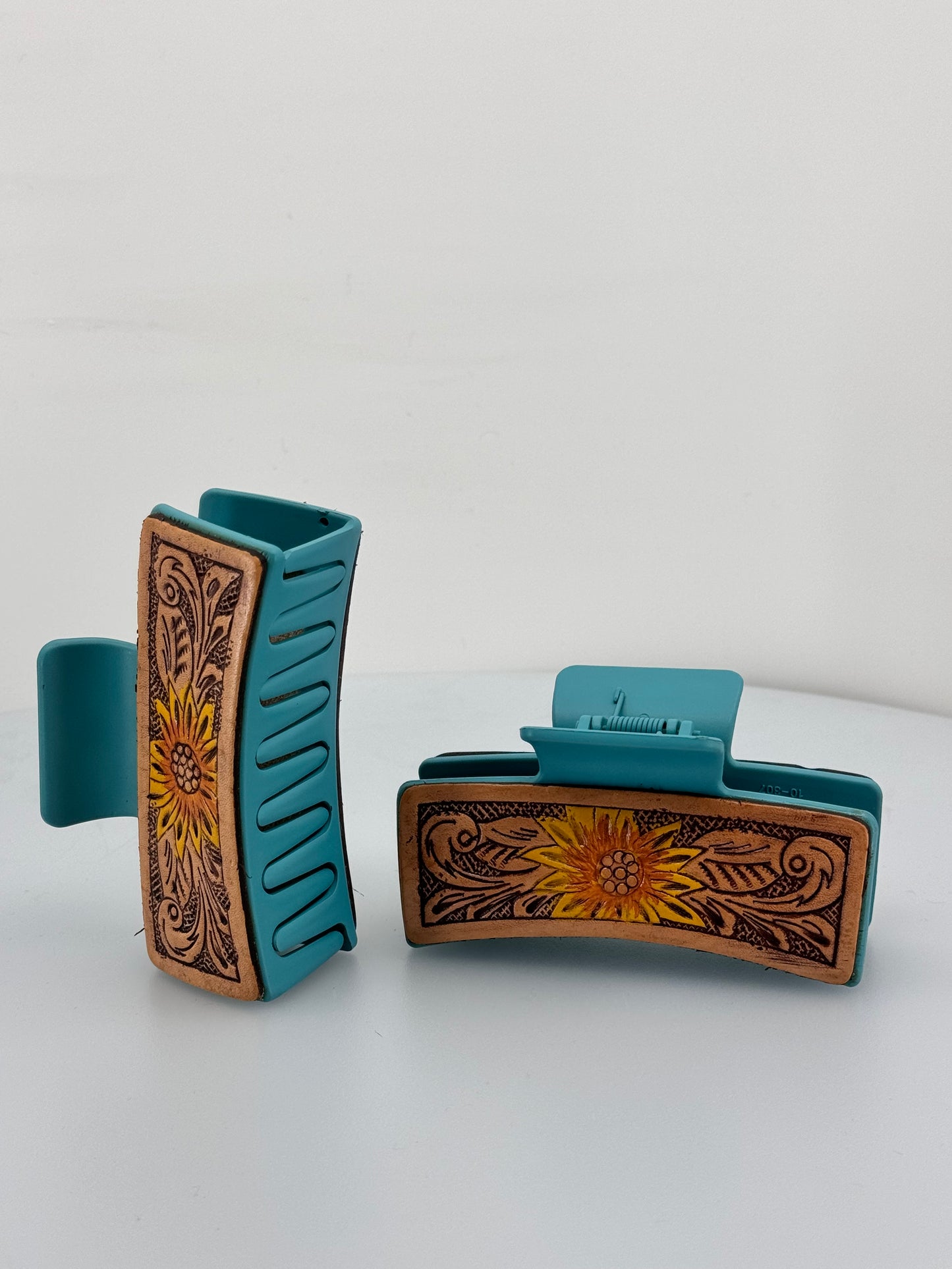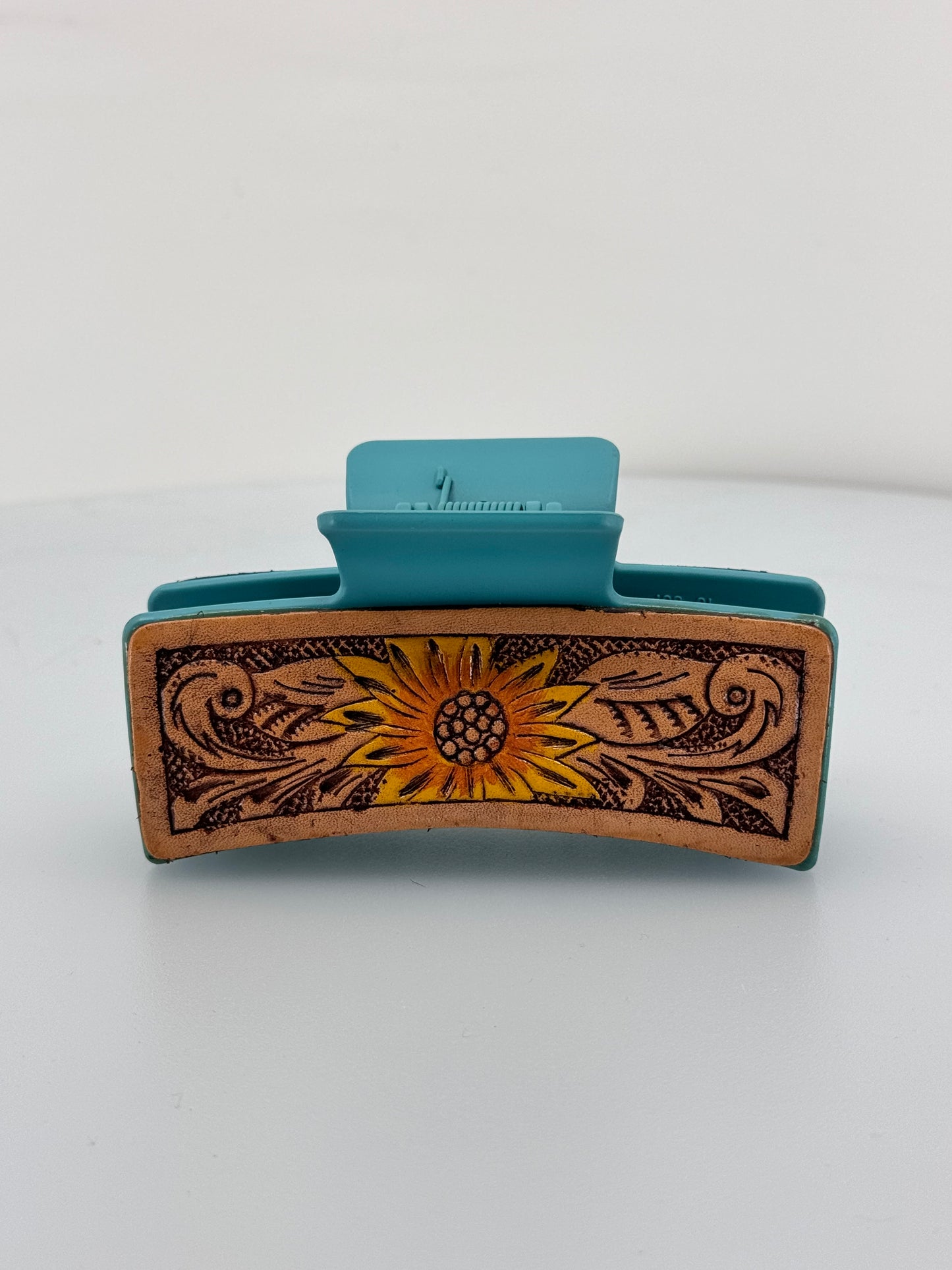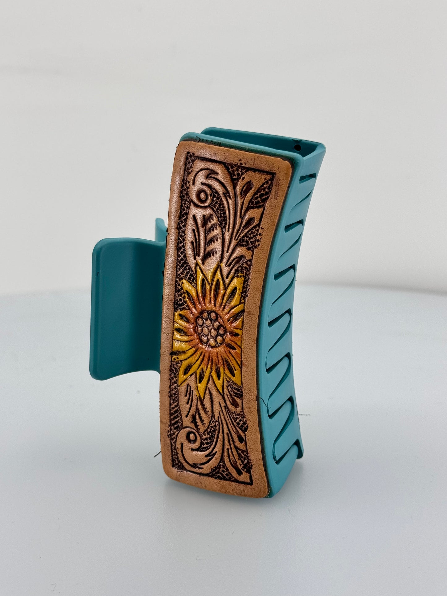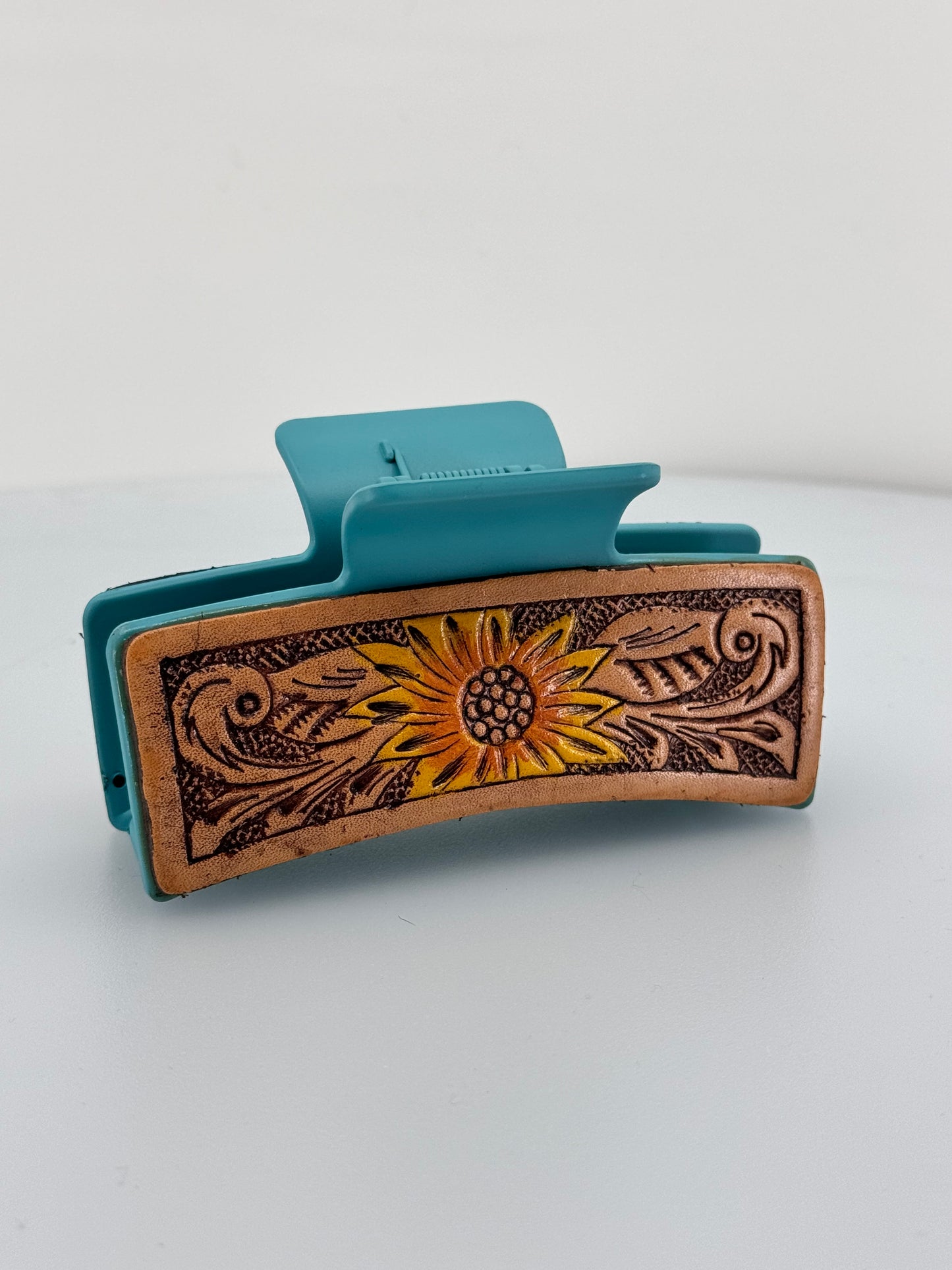 Embrace the beauty of the western flair with our Large Leather Tooled Sunflower Hair Claw Clip. Crafted from genuine leather, this claw clip features a hand tooled sunflower design that adds a touch of nature to your hair. Perfect for those who appreciate unique and western accessories!
