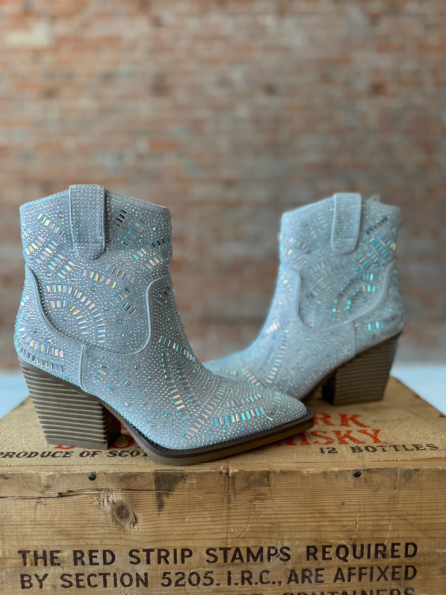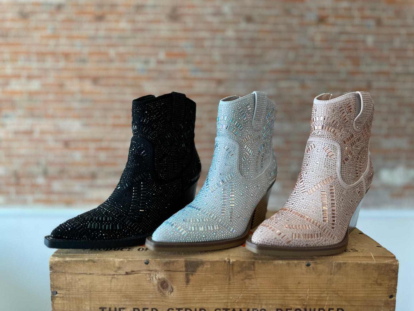 Discover a world of glamour with the stunning Madison Rhinestone Booties. Sparkle and shine with these fashionable womens booties, featuring rhinestones, glitter, a side zipper, and a stack heel. Perfect for a night out or a concert, make a statement with the stylish Madison. Get ready to turn heads!