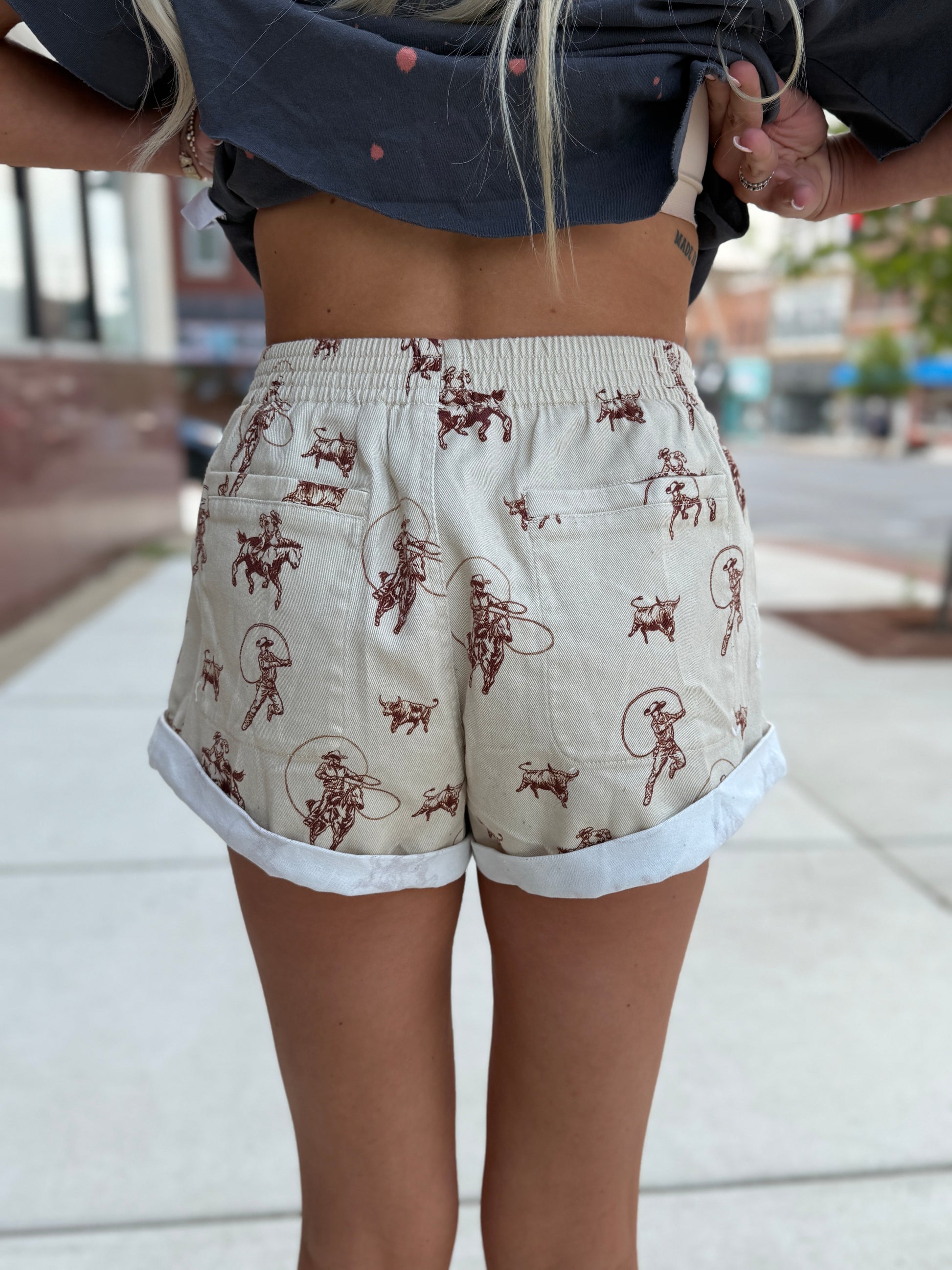 Channel carefree summer vibes and western charm with our Rodeo Days Western-Print Cotton Shorts. These eye-catching shorts are crafted from a soft, breathable cotton blend that keeps you cool and comfortable while offering the perfect amount of stretch for all-day wear. Designed with an elastic waistband for a flexible fit, they hug your waist just right without feeling restrictive.