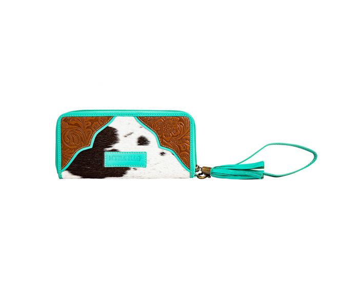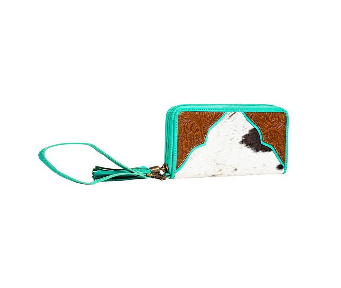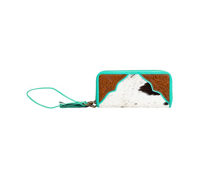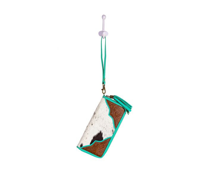 Experience luxury and style with the Stella Clutch Hairon Wallet! Made with beautiful hair-on hide and hand-tooled leather, this wallet exudes elegance. The spacious interior features a zippered pocket and the tasseled zipper-close adds a touch of boho charm. With a matching leather wristlet strap, this wallet is both practical and darling.