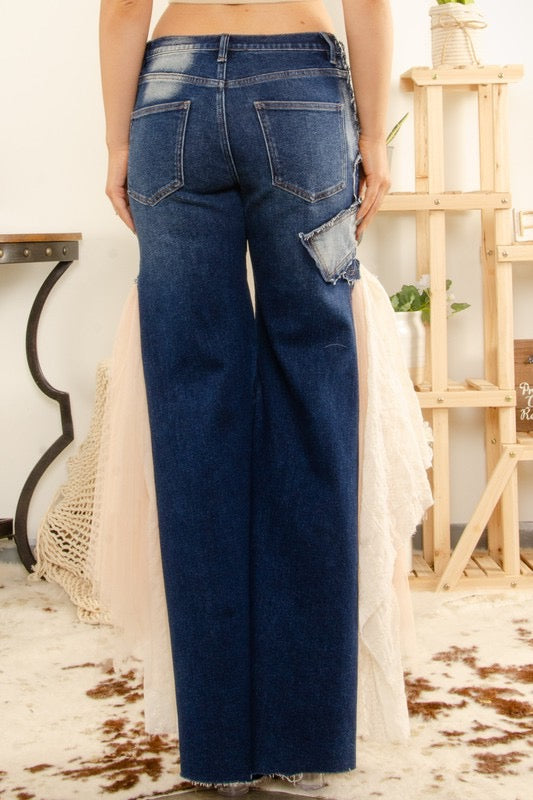 Stretchy Denim Mesh Detail Flare Jeans