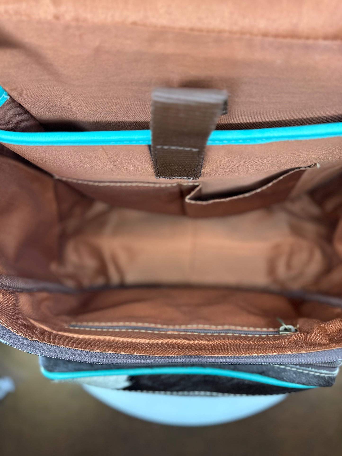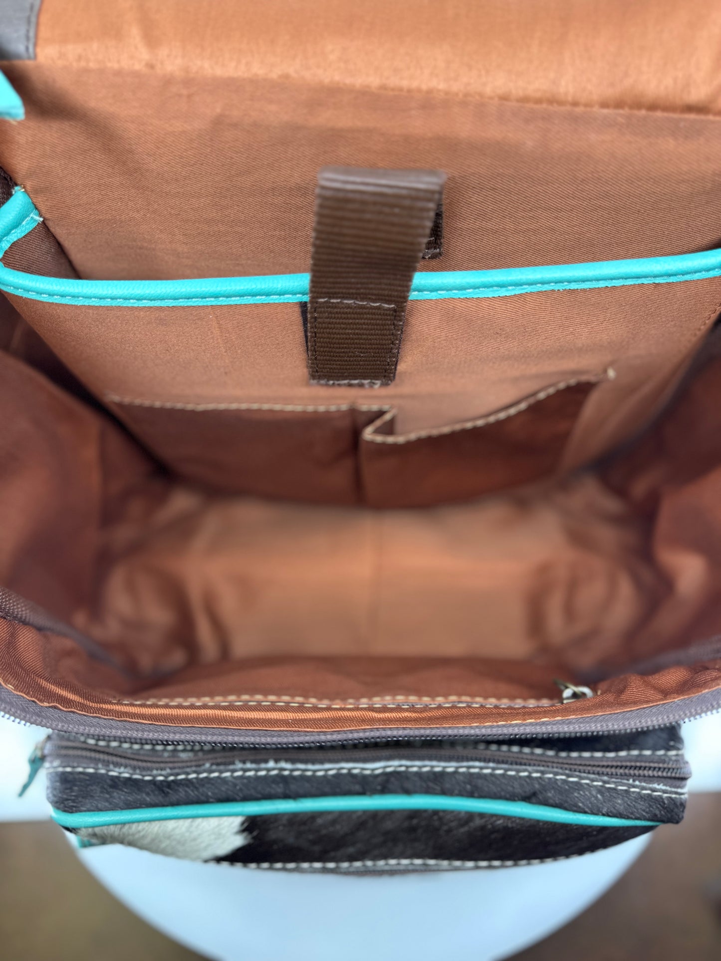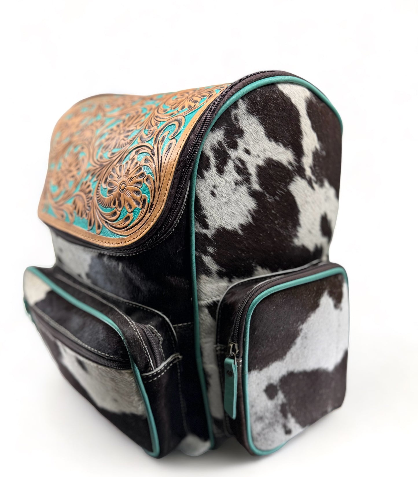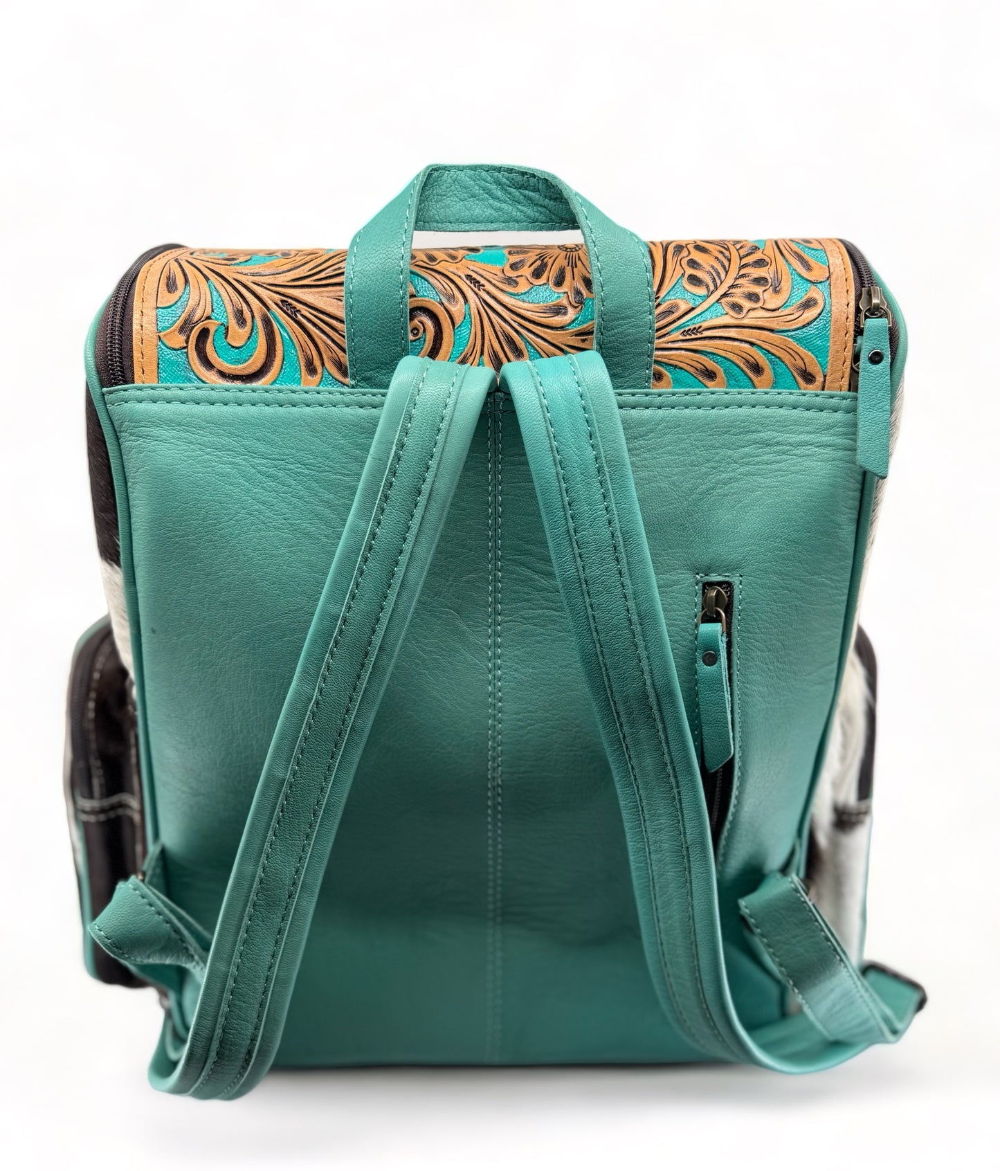 Indulge in luxury with our Ultimate Leather Tooled & Hairon Backpack. This exquisite piece boasts a laptop pouch, conceal carry pocket, and multiple zippered pockets for ultimate organization. The stunning turquoise detailing and stitching make it perfect for school, travel, or as a chic purse alternative. Elevate your style with this exclusive backpack.