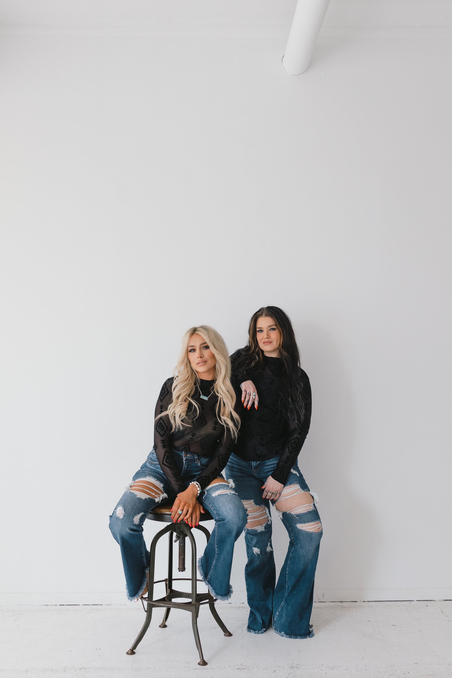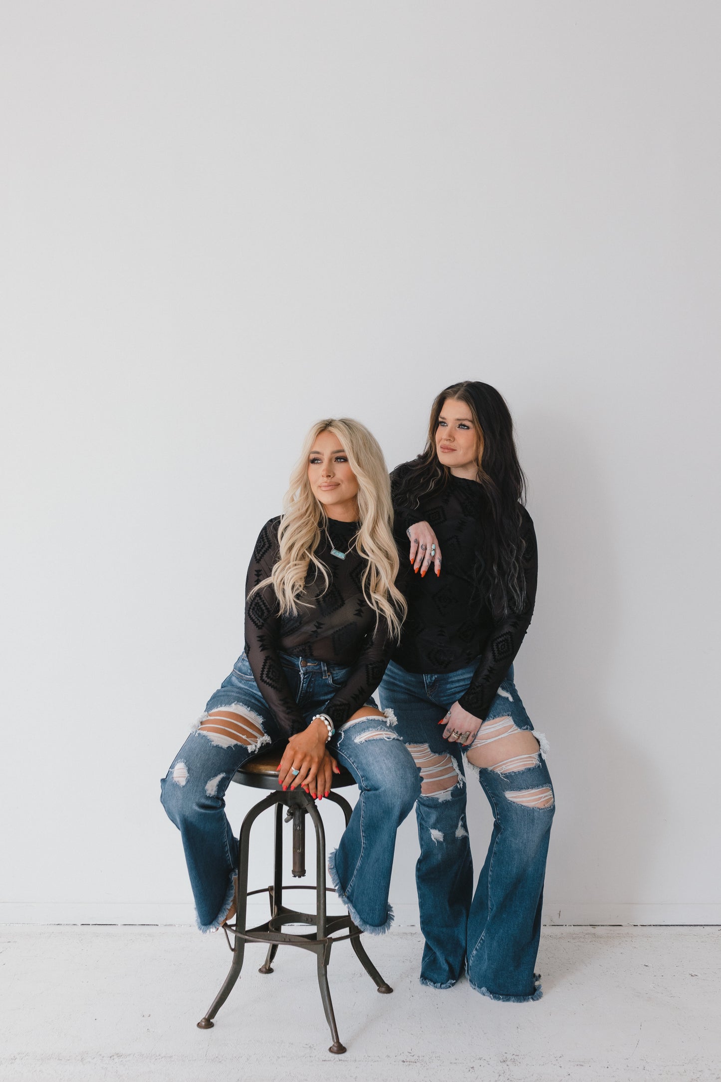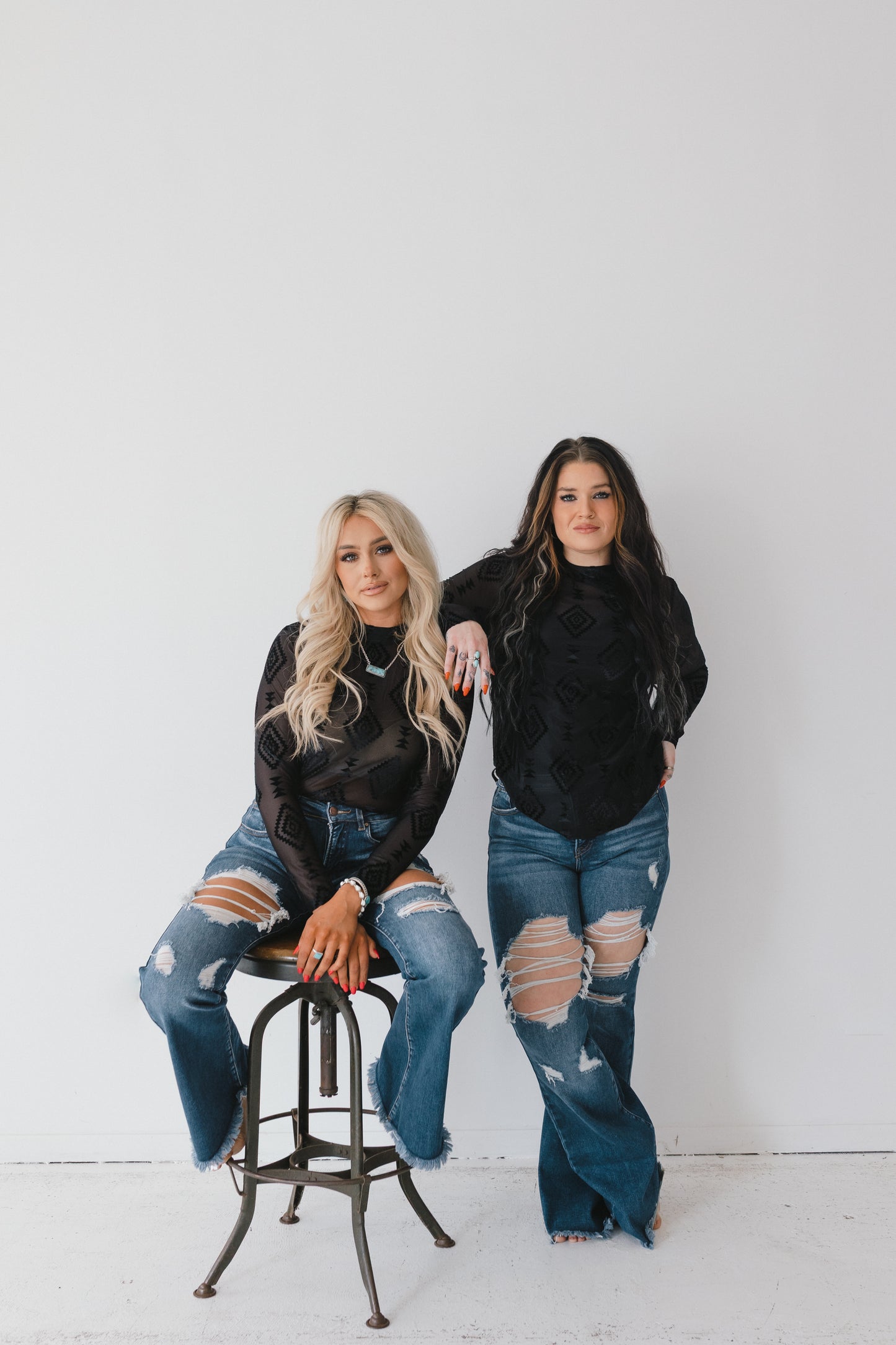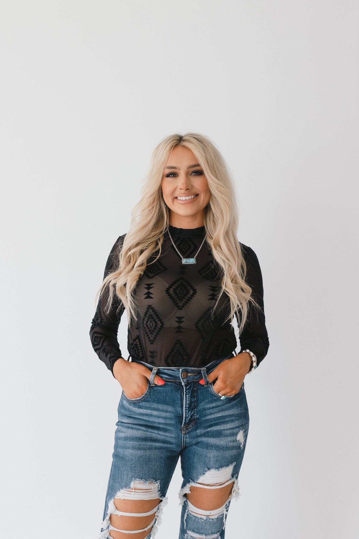 Make a bold statement with the Western Whispers Sheer Velvet Top, a perfect fusion of edgy elegance and Western charm. Designed to captivate, this top features a delicate sheer mesh base adorned with intricate black velvet Aztec detailing, creating a striking contrast of texture and pattern. Whether you're dressing up for a night out or adding a touch of Western-inspired flair to your everyday look, this top is sure to turn heads.
