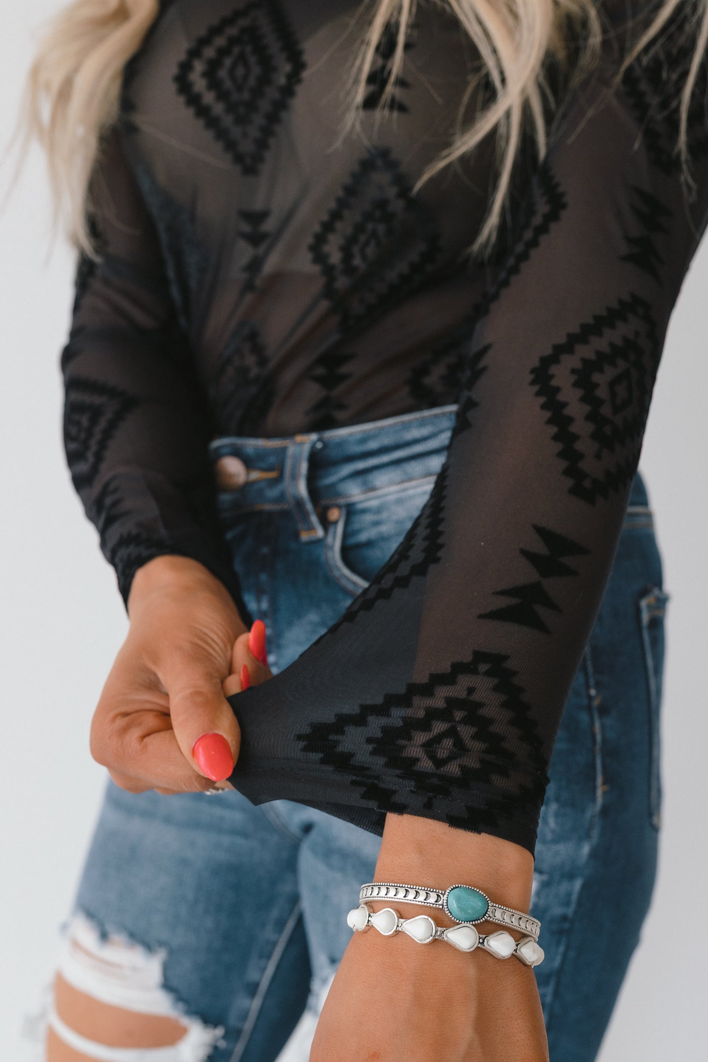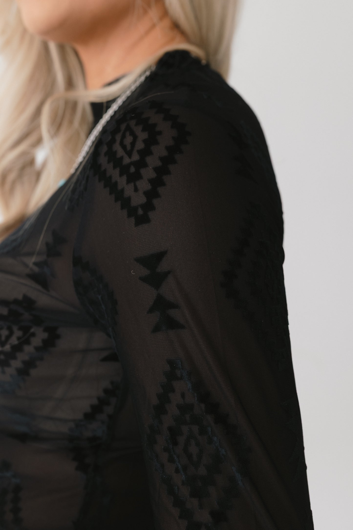 Embrace the spirit of the West with the Western Whispers Sheer Velvet Top—a versatile, statement-making piece that blends delicate elegance with bold Aztec-inspired design.