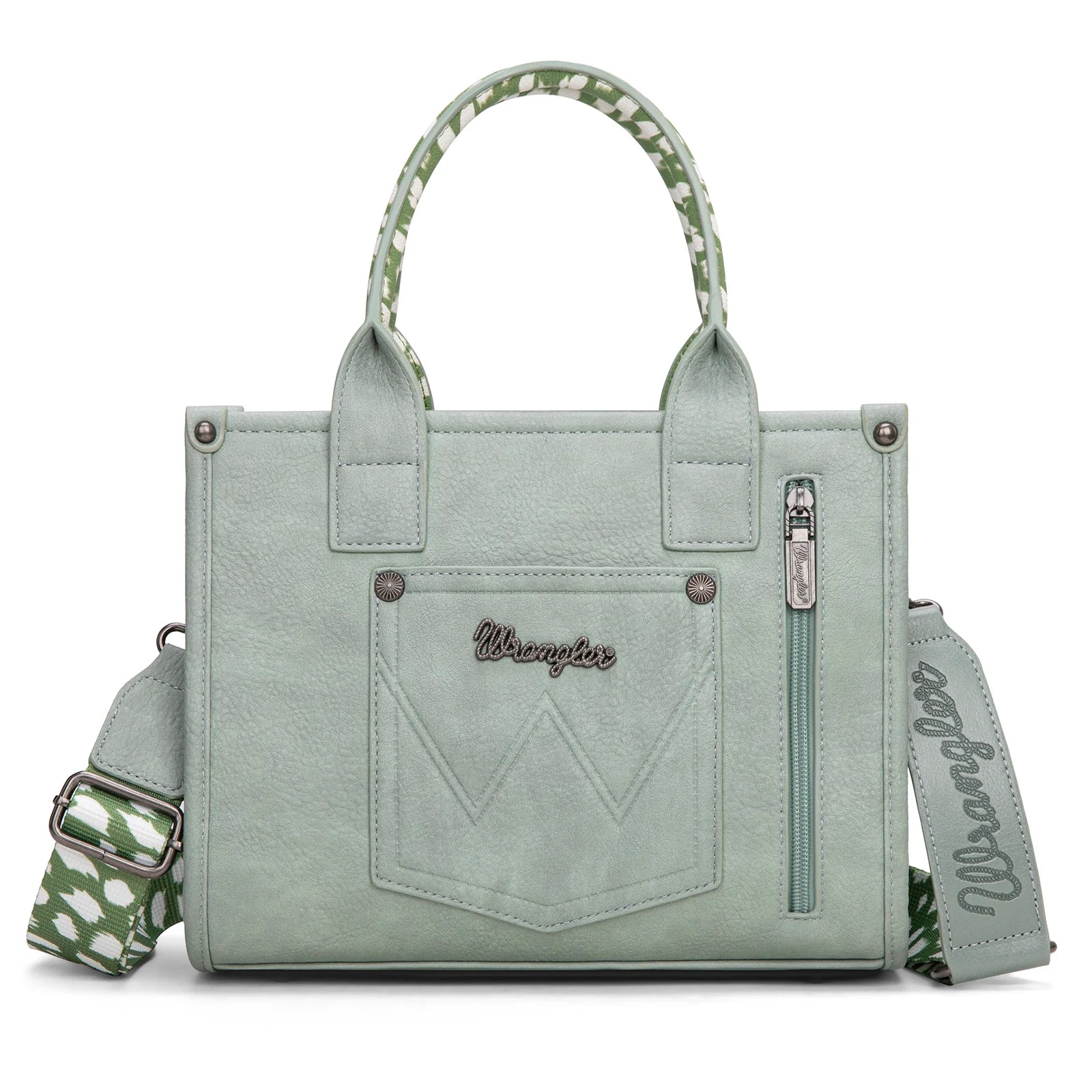 Signature Wrangler branding: Logo applique prominently featured on the front panel